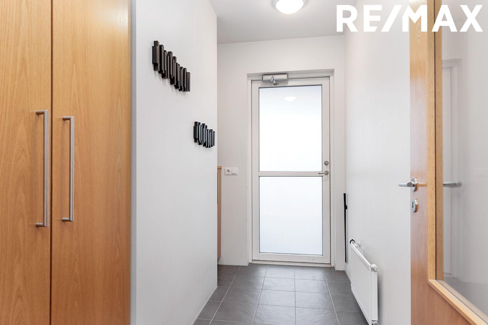 Forstofan er rúmgóð með flísalögðu gólfi og fallegum innbyggðum sérsmíðuðum skápum úr eik.