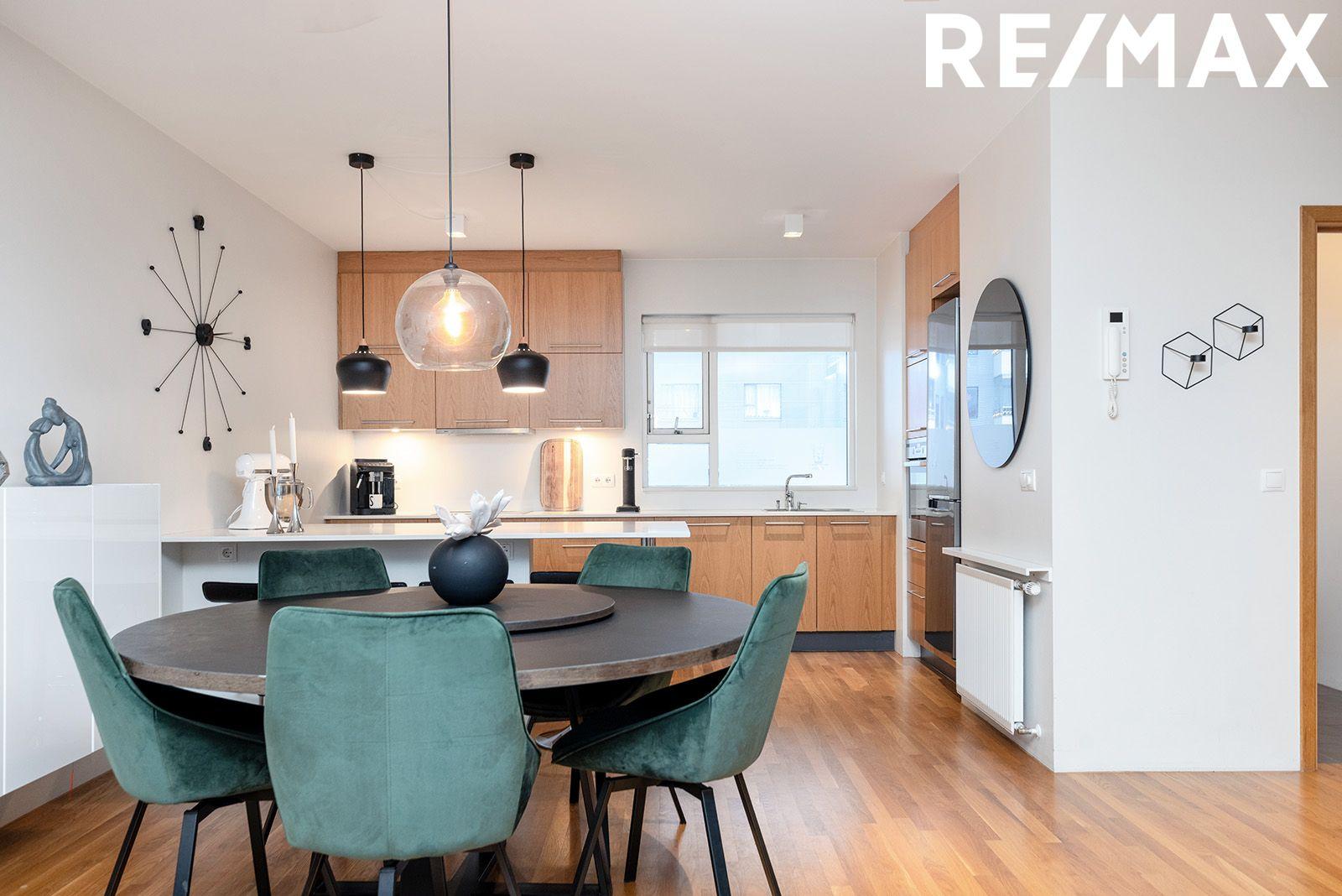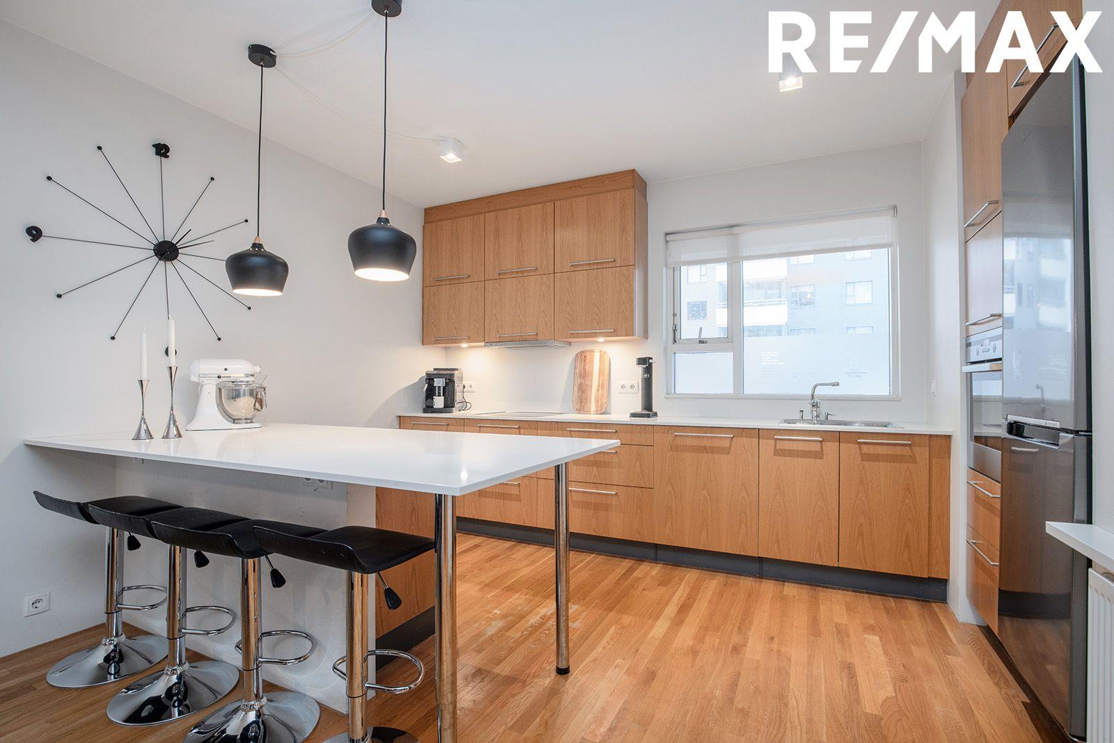 Eldhúsið er opið inn í stofu með fallegri sérsmíðaðri innréttingu úr eik með miklu skápaplássi og ljúflokunum á skúffum, granítborðplata. AEG helluborð með viftu yfir, AEG ofn í vinnuhæð, innbyggð uppþvottavél, gert ráð fyrir háum ísskáp í innréttingu, eyja sem hægt er að sitja við með skúffum með ljúflokunum, granít borðplata, parket á gólfi.