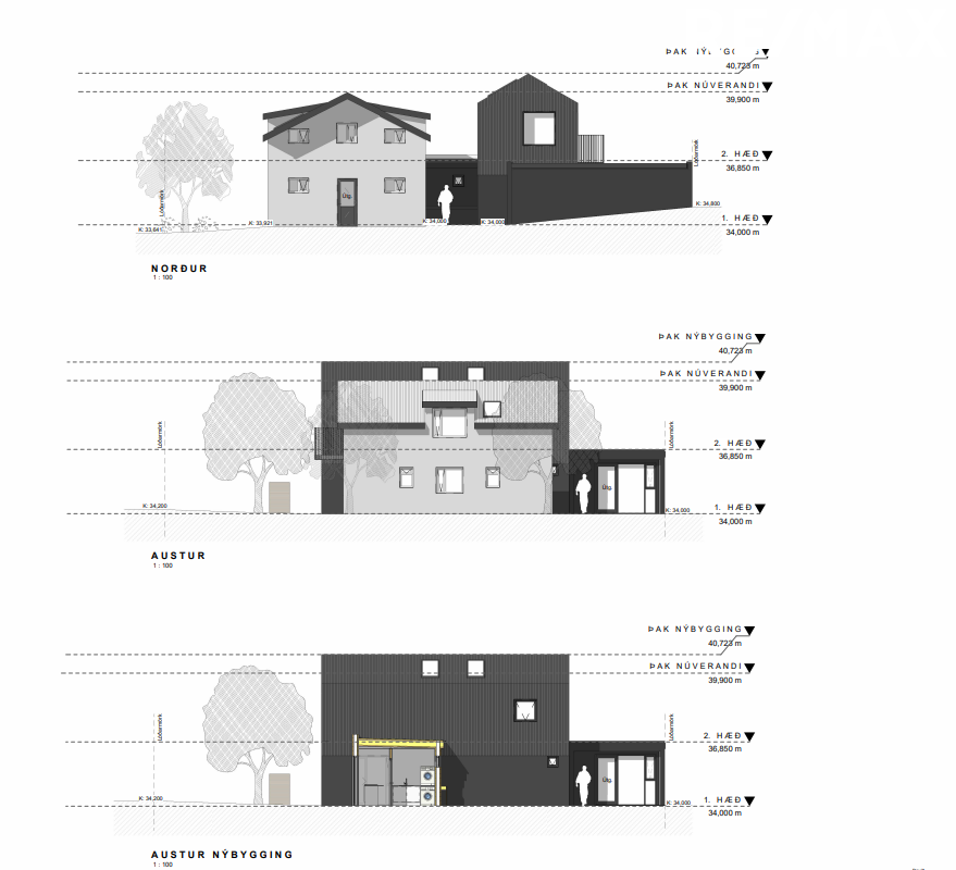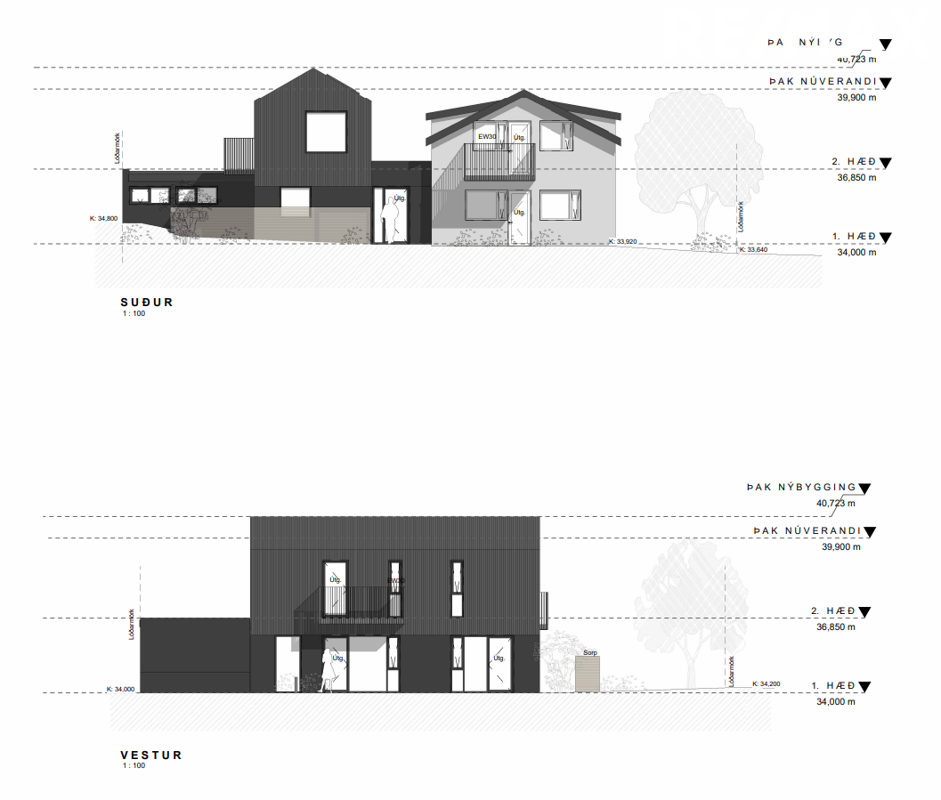 Núverandi áform gera ráð fyrir að nýbyggingin verði út timbri og klædd með álklæðningu.