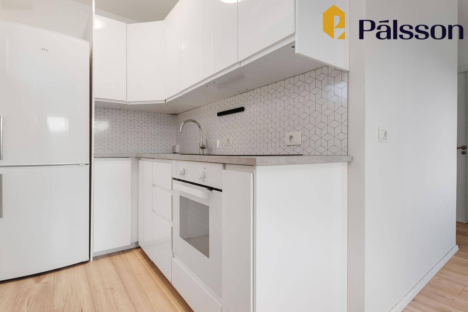 Eldhús: eldhúsið er opið að stofunni, með fallegri hvítri innréttingu og ágætu borðplássi.