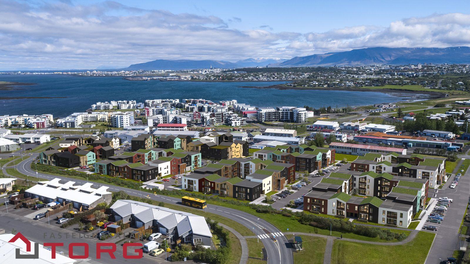 Frágangur lóðar: Lóð verður skilað fullfrágenginni. Megin göngustígar verða ýmist hellulagðir eða steyptir og grassvæði þökulögð. Leiksvæði.