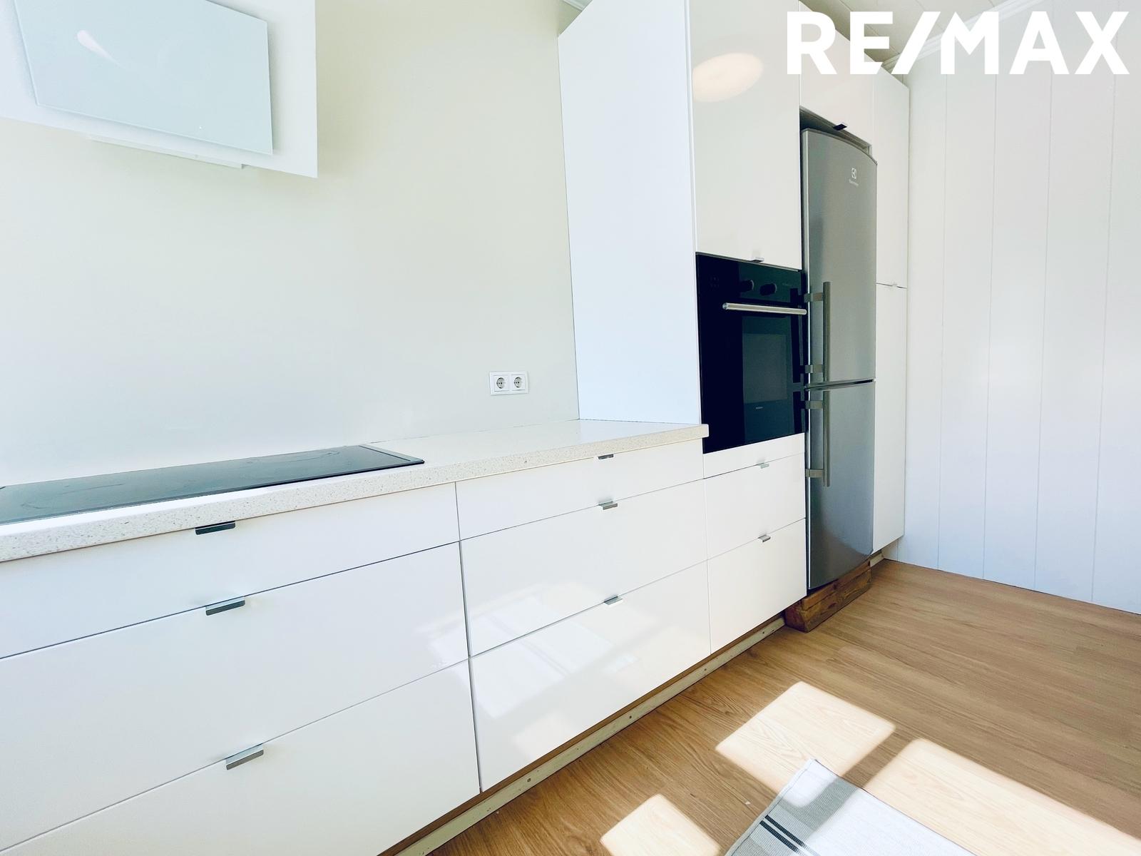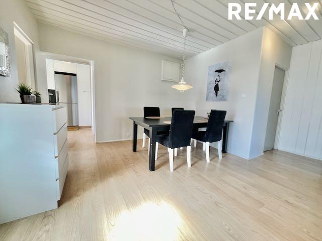 Eldhús: Uppgerð sprautulökkuð hvít innrétting og hvítar vegghillur, ljósgrá-yrjótt borðplata. Siemens bakaraofn í vinnuhæð, AEG keramikhelluborð, nýr hvítur veggháfur. Tengi fyrir þvottavél og ísskáp. Klæðning í eldhúsi og lofti er nýlega endurnýjað.