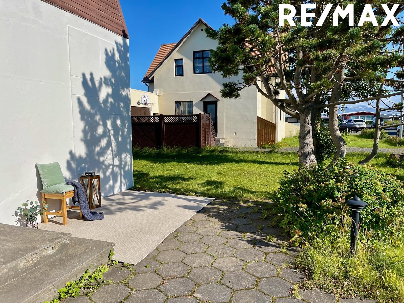 Lóðin: Stór og rúmgóð 463 fm lóð með grónum sólríkum garði. Verönd er framan við hús með steinhellum, innst í garði sunnanmegin er eldri viðarverönd (til uppfærð teikning) sem og aftan við er nett viðarverönd og gras. Þar er þvottasnúra. Teikning af nýrri stórri viðarverönd í suðurhluta garðs fylgir. (sjá í myndir). Gras, runnar og tré. Þvottasnúra. Afturhluti garðsins er lokaður með girðingum og gæti því hentað hundum vel.
