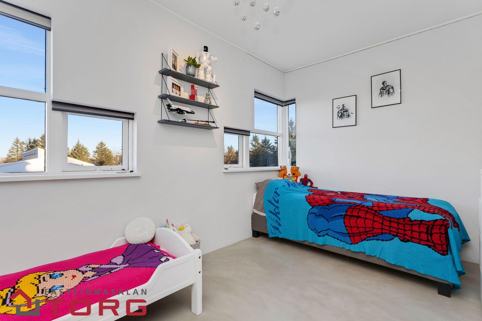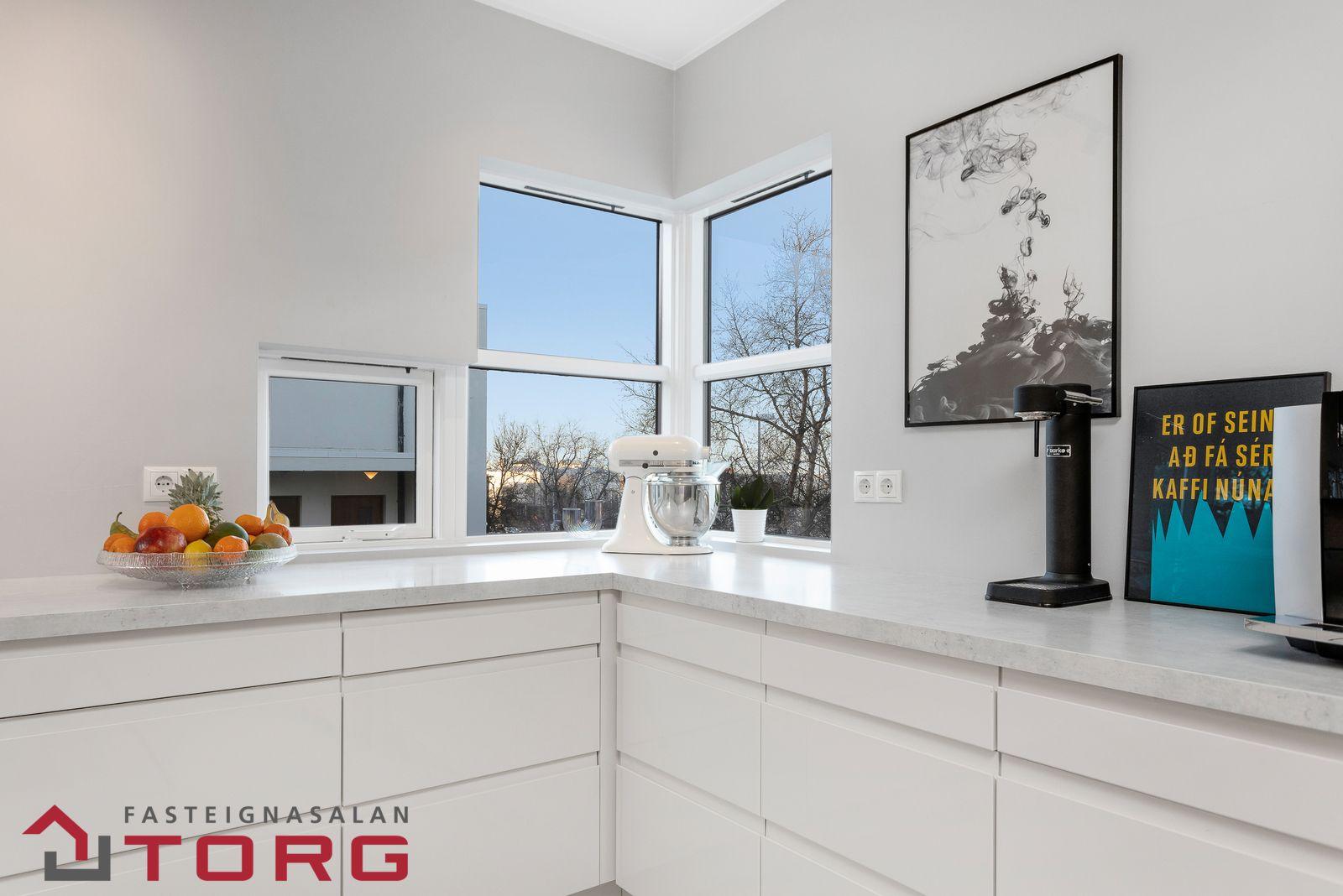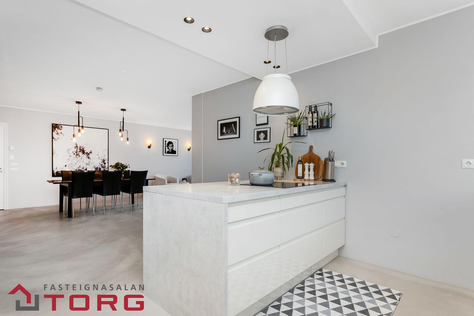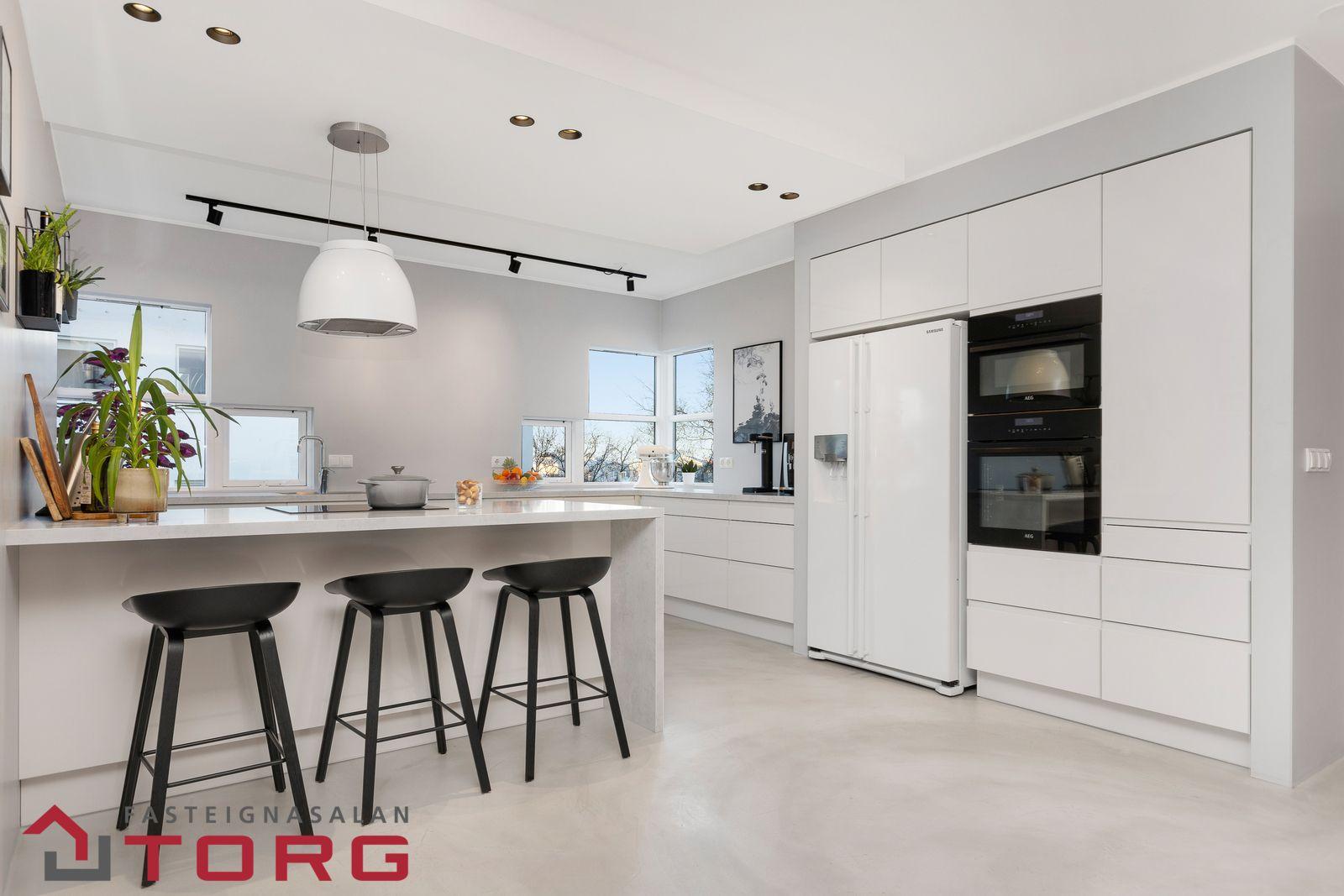 Eldhús: Eldhúsið er mjög vel útbúið með hvítri innréttingu frá HTH og heimilistæki frá AEG. Mjög gott skápapláss, gert er ráð fyrir tvöföldum ísskáp, uppþvottavél er innbyggð og tveir ofnar eru í vinnuhæð. Stór vaskur og span helluborð er í eldhúsinu ásamt eyju sem hægt er að sitja við.