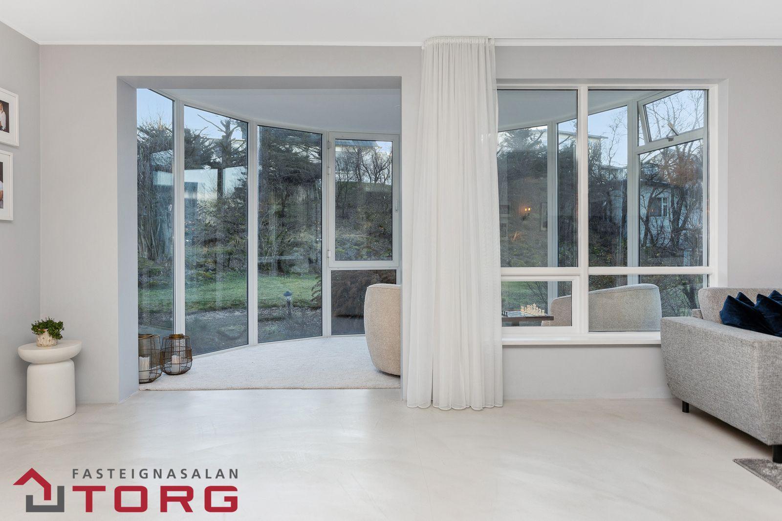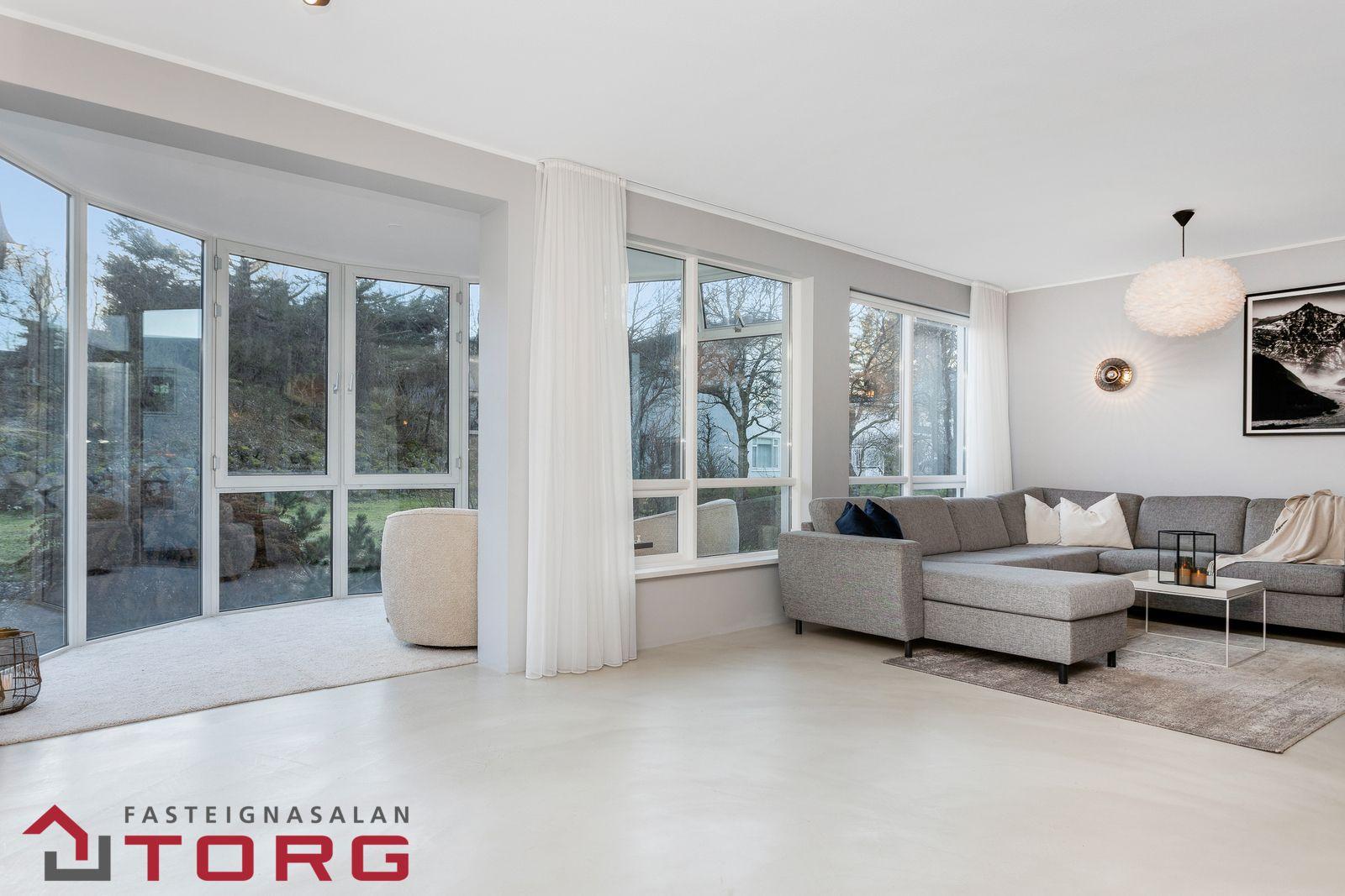 Stofa/borðstofa: Stofa eignarinnar er mjög rúmgóð björt og opin og er samliggjandi borðstofu. Innaf stofu er upphitað sólhús með fallegum bogadregnum glugga sem setur skemmtilegan svip á eignina og með útsýni yfir gróinn og fallegan garð. Möguleiki er að stúka af fjórða svefnherbergið af stofunni.