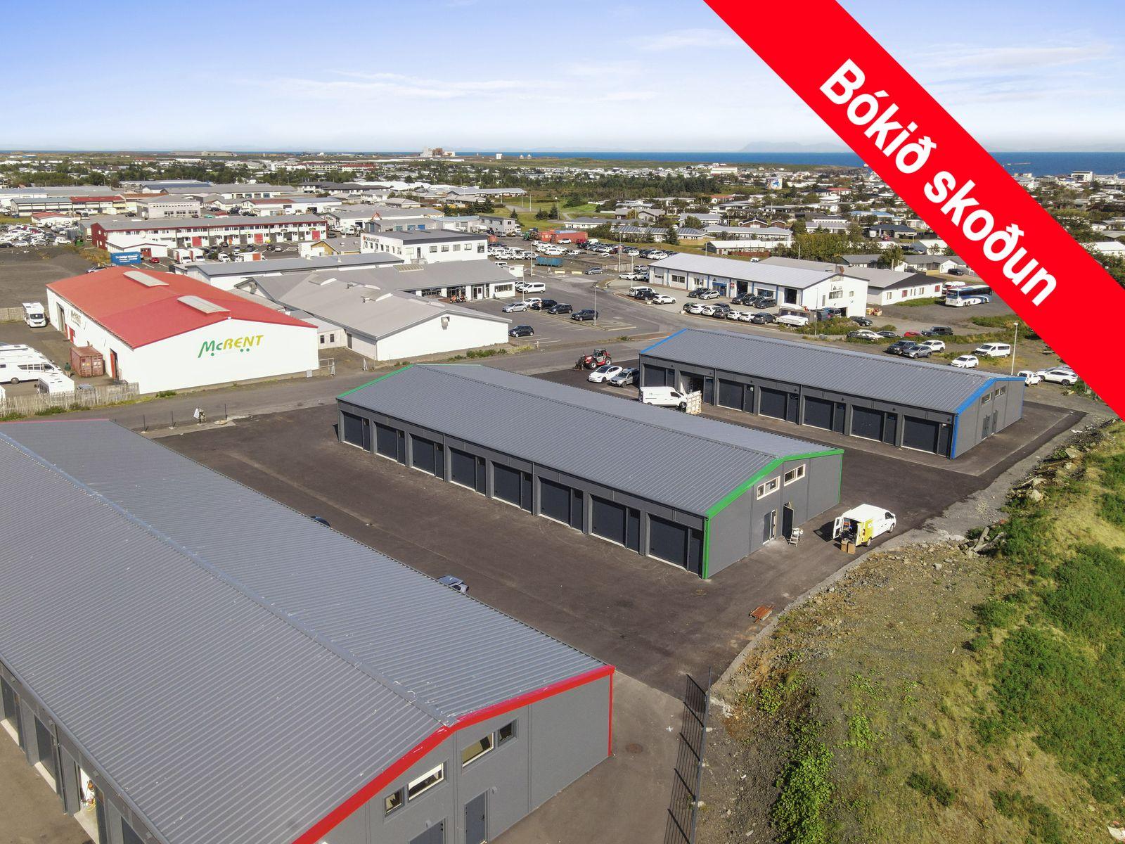 Nánari lýsing: Húsið mun vera geymsluhúsnæði. Um er að ræða 88 stk geymslubil byggð úr límtré og yleiningum frá Límtré Vírnet. Fjórir matshlutar eru á lóðinni, hver matshluti er með mis mörgum geymslubilum. 16 bil eru í þessum matshluta. Stærð hvers geymslubils er um 43 fm í þessum matshluta Húsið er reist úr límtré sem reist er á staðsteyptar undirstöður. Húsið er klætt að utan með fjöldaframleiddum yleiningum sem koma með innbrenndum lit. Litir eru almennt dökkgráir. Flassningar verða í einkennandi litum fyrir hvern matshluta, þessi matshluti er grænn. Húsin eru reist á staðsteyptum sökkli. Samanlögð heildar lóðarstærð er um 9.894 fm. Stofnað hefur verið húsfélag sem sér um rekstur á sameiginlegri lóð og öryggiskerfi.