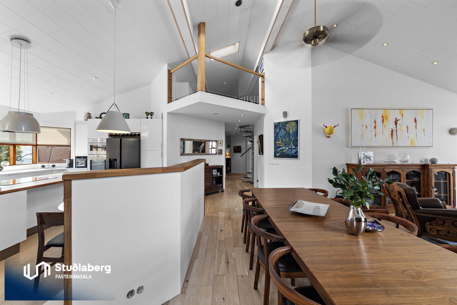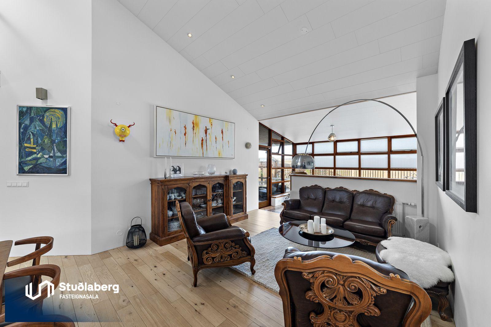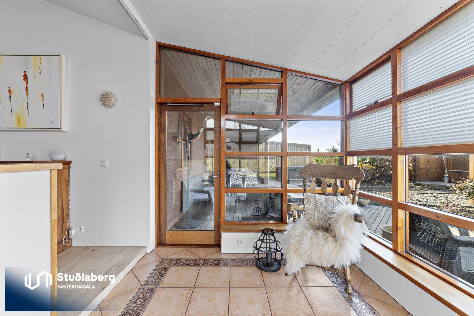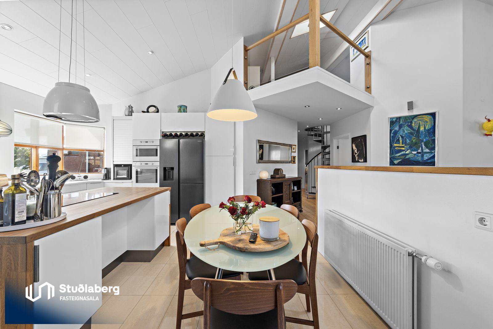 Forstofa hefur flísar á gólfi. Eldhúsið hefur flísar á gólfi og er virkilega bjart og fallegt með stórri eyju og mikið skápapláss. Inn af eldhúsinu er þvottahús. Þaðan er útgengt á lóð. Stofa hefur parket á gólfi er björt og rúmgóð, Inn af stofunni er hlýleg og björt sólstofa sem hefur flísar á gólfi og útgengt á afgirta verönd með heitum potti. Í miðrými er 30m2 efrihæð sem er ekki skráð þar eru opnanlegir þakgluggar. þar er eitt svefnherbergi. Baðherbergi hefur flísar á gólfi, baðkar ,upphengt salernig og góða innréttingu. Svefnherbergin eru fjögur og hafa parket á gólfum. Innaf hjónaherbergi er salerni og þaðan útgengt á verönd. Bílskúr er rúmgóður með flísum á gólfi og góðu skápaplássi. Geymsluloft er í bílskúr.
