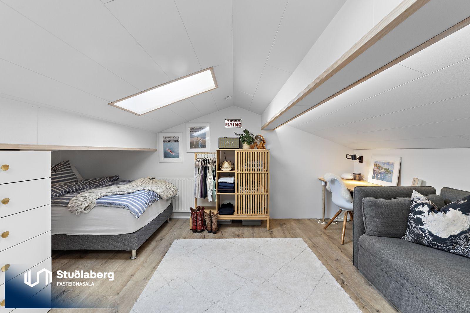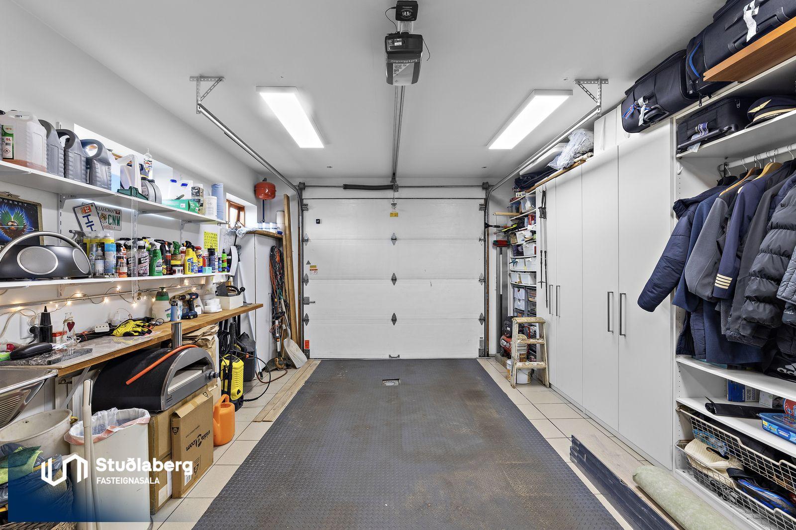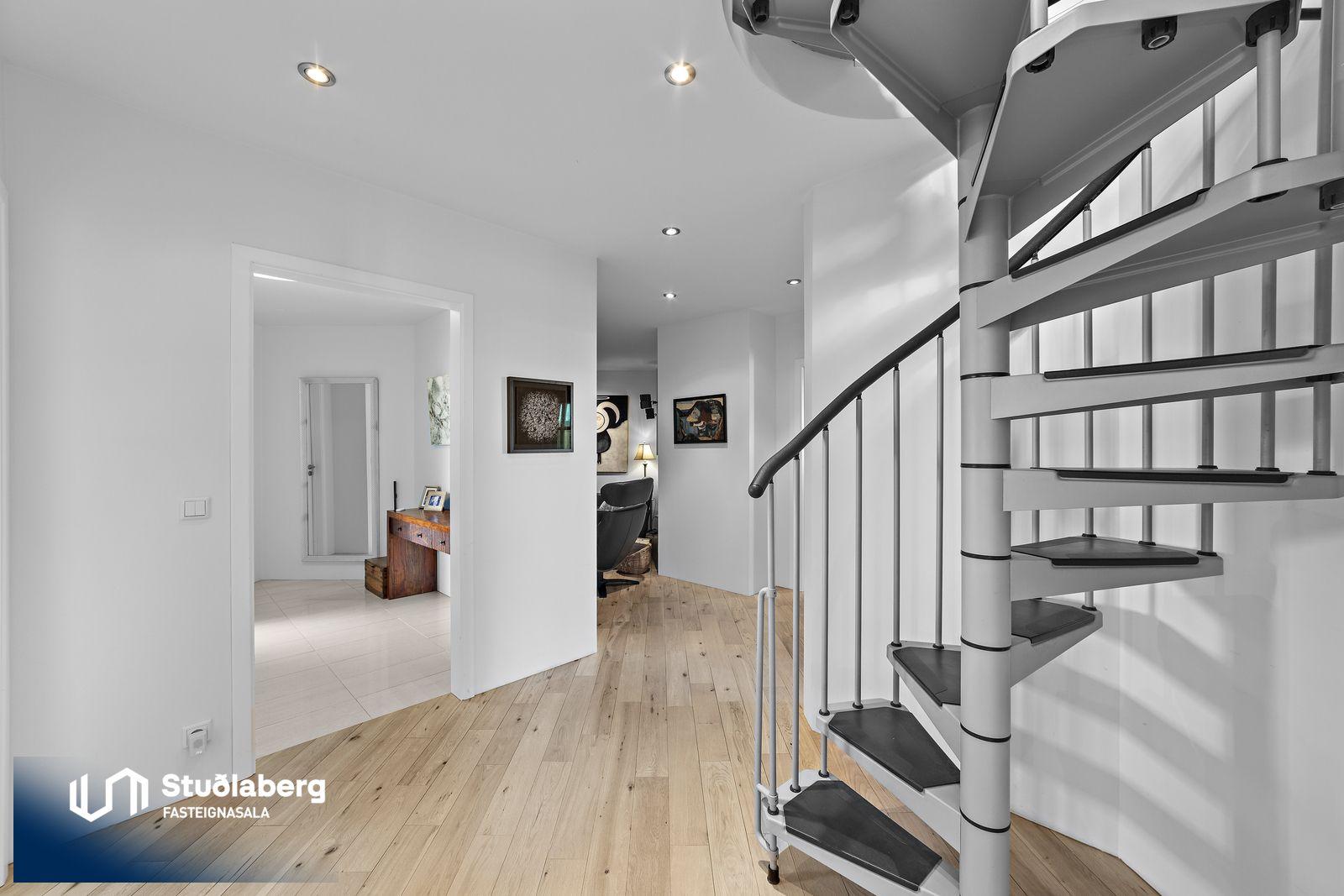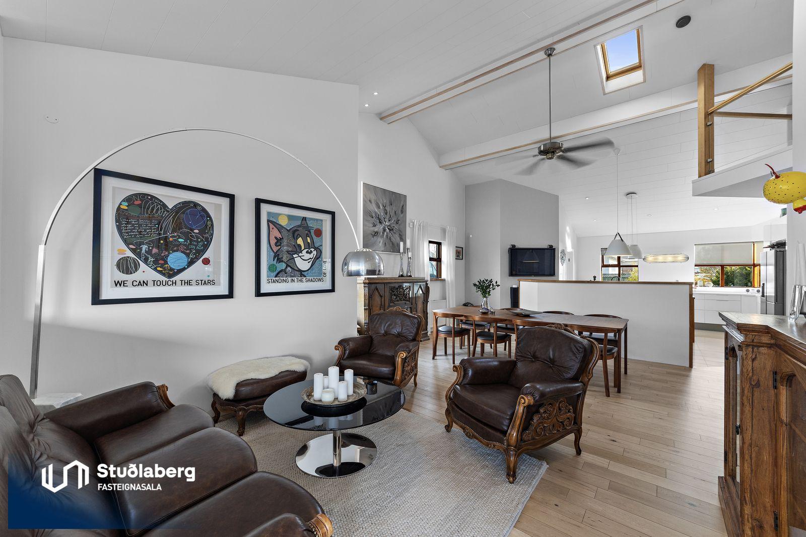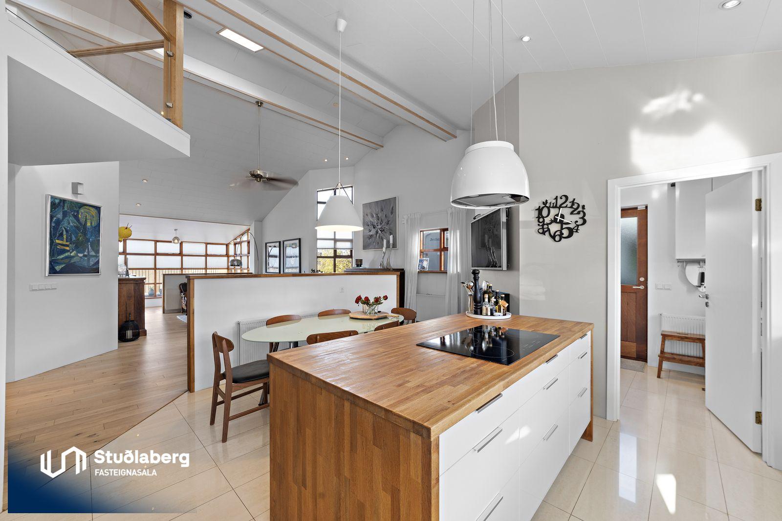 Forstofa hefur flísar á gólfi. Eldhúsið hefur flísar á gólfi og er virkilega bjart og fallegt með stórri eyju og mikið skápapláss. Inn af eldhúsinu er þvottahús. Þaðan er útgengt á lóð. Stofa hefur parket á gólfi er björt og rúmgóð, Inn af stofunni er hlýleg og björt sólstofa sem hefur flísar á gólfi og útgengt á afgirta verönd með heitum potti. Í miðrými er 30m2 efrihæð sem er ekki skráð þar eru opnanlegir þakgluggar. þar er eitt svefnherbergi. Baðherbergi hefur flísar á gólfi, baðkar ,upphengt salernig og góða innréttingu. Svefnherbergin eru fjögur og hafa parket á gólfum. Innaf hjónaherbergi er salerni og þaðan útgengt á verönd. Bílskúr er rúmgóður með flísum á gólfi og góðu skápaplássi. Geymsluloft er í bílskúr.