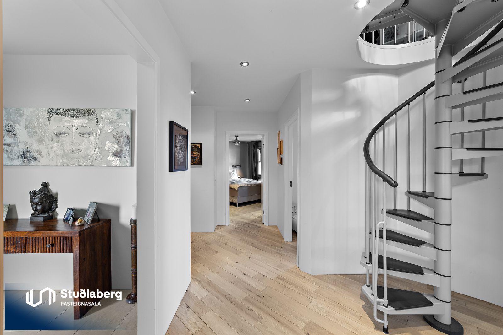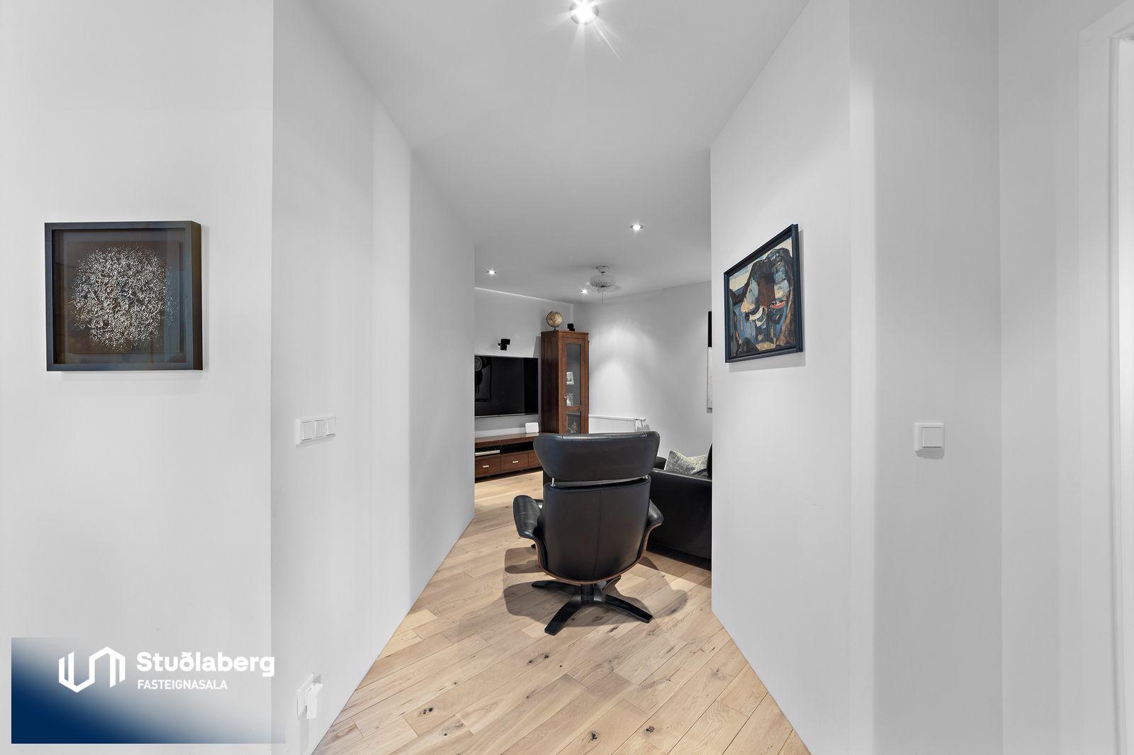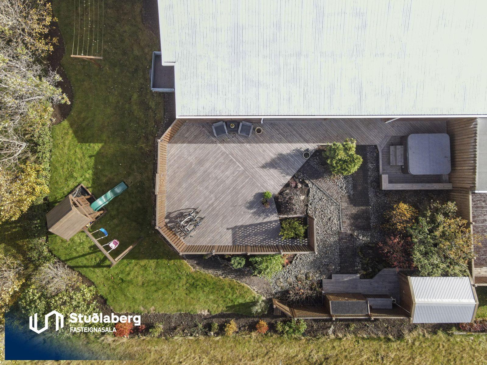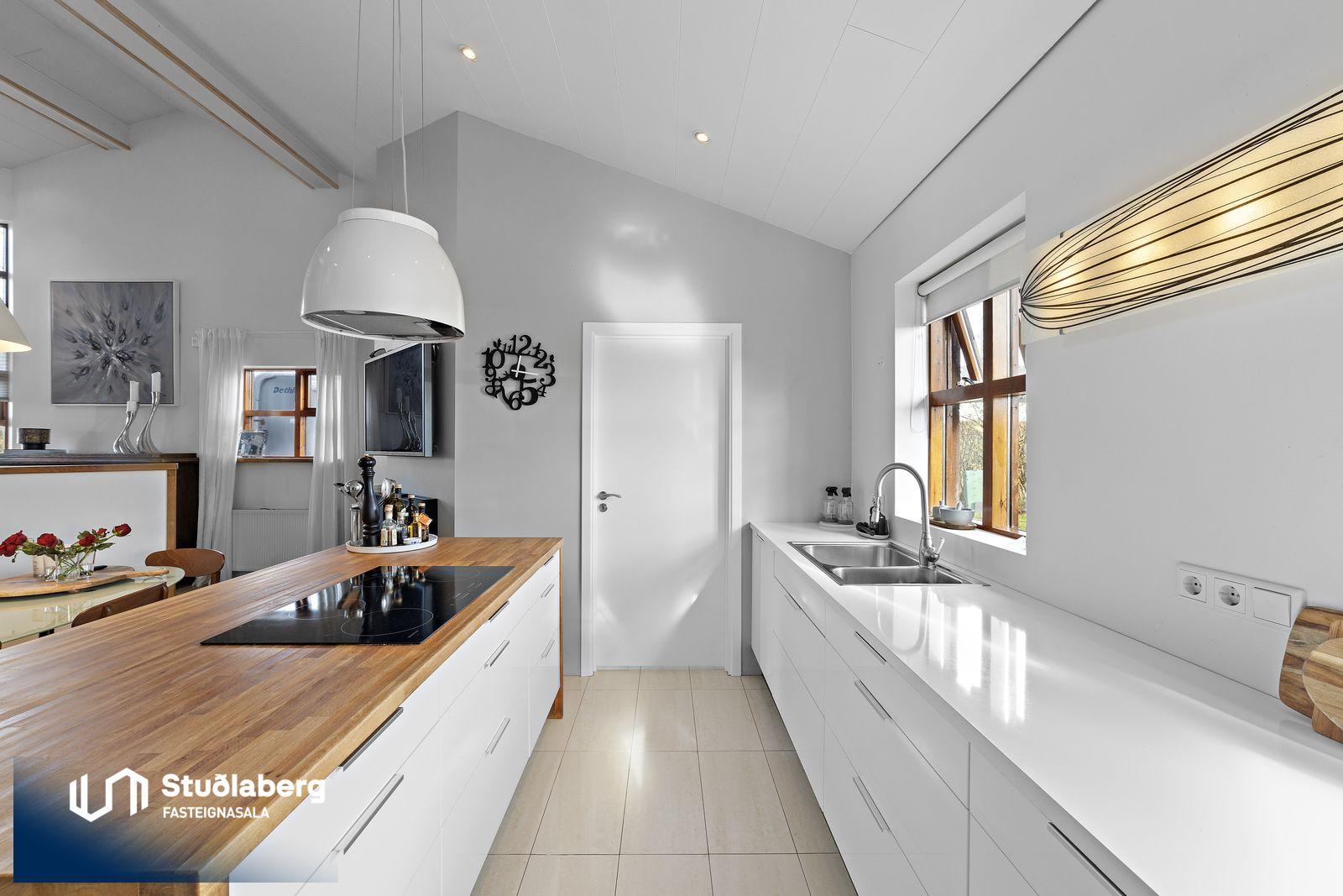 Forstofa hefur flísar á gólfi. Eldhúsið hefur flísar á gólfi og er virkilega bjart og fallegt með stórri eyju og mikið skápapláss. Inn af eldhúsinu er þvottahús. Þaðan er útgengt á lóð. Stofa hefur parket á gólfi er björt og rúmgóð, Inn af stofunni er hlýleg og björt sólstofa sem hefur flísar á gólfi og útgengt á afgirta verönd með heitum potti. Í miðrými er 30m2 efrihæð sem er ekki skráð þar eru opnanlegir þakgluggar. þar er eitt svefnherbergi. Baðherbergi hefur flísar á gólfi, baðkar ,upphengt salernig og góða innréttingu. Svefnherbergin eru fjögur og hafa parket á gólfum. Innaf hjónaherbergi er salerni og þaðan útgengt á verönd. Bílskúr er rúmgóður með flísum á gólfi og góðu skápaplássi. Geymsluloft er í bílskúr.