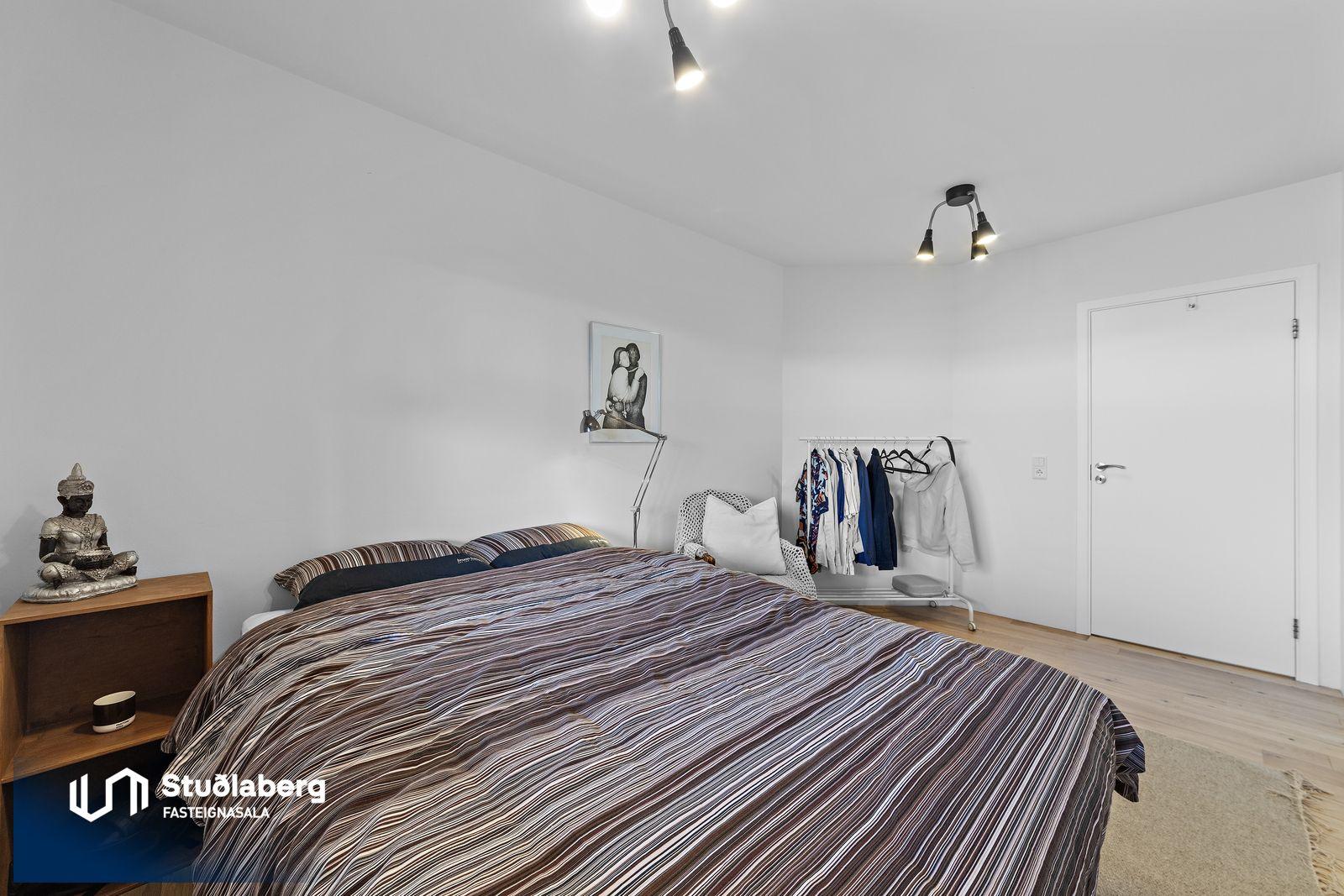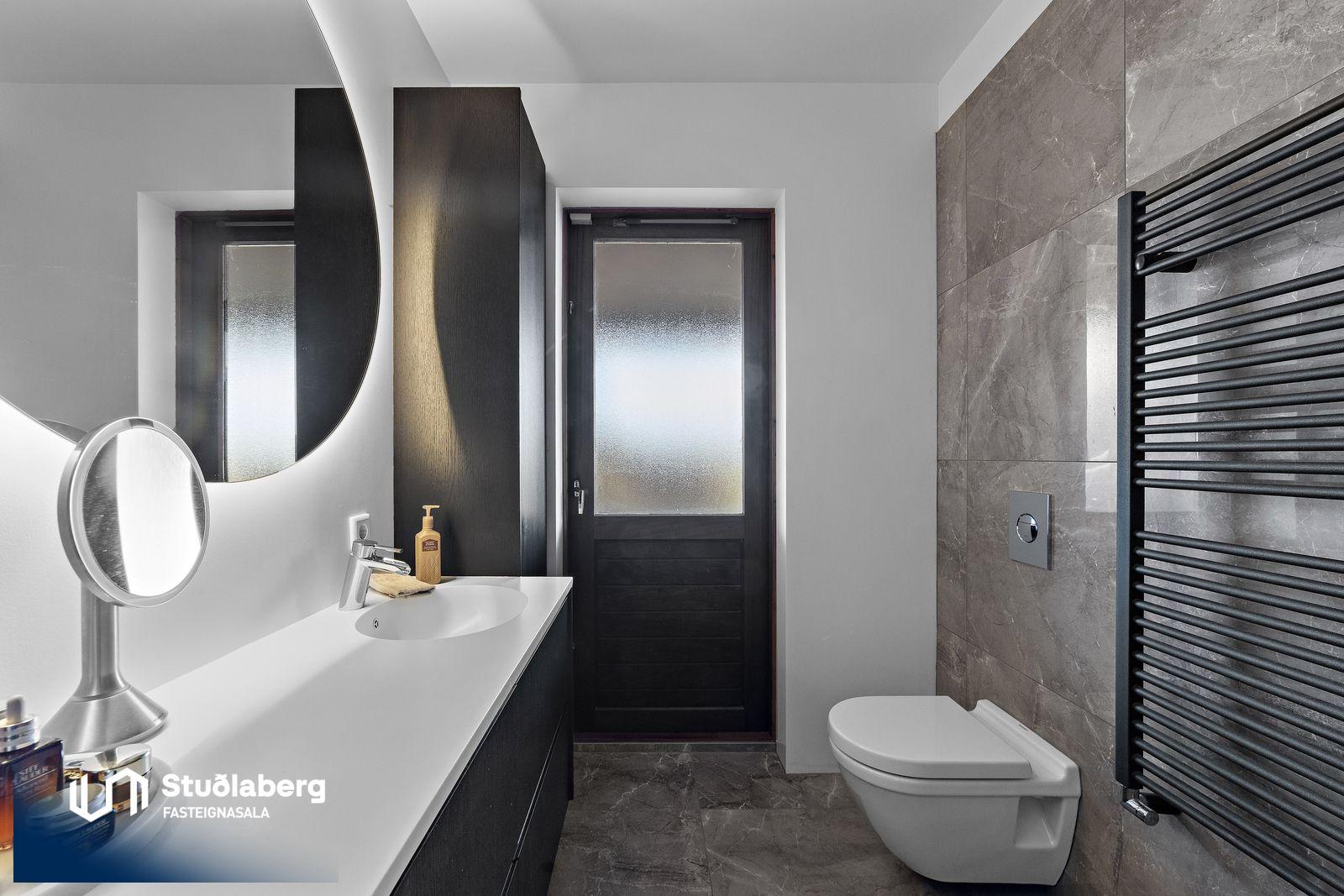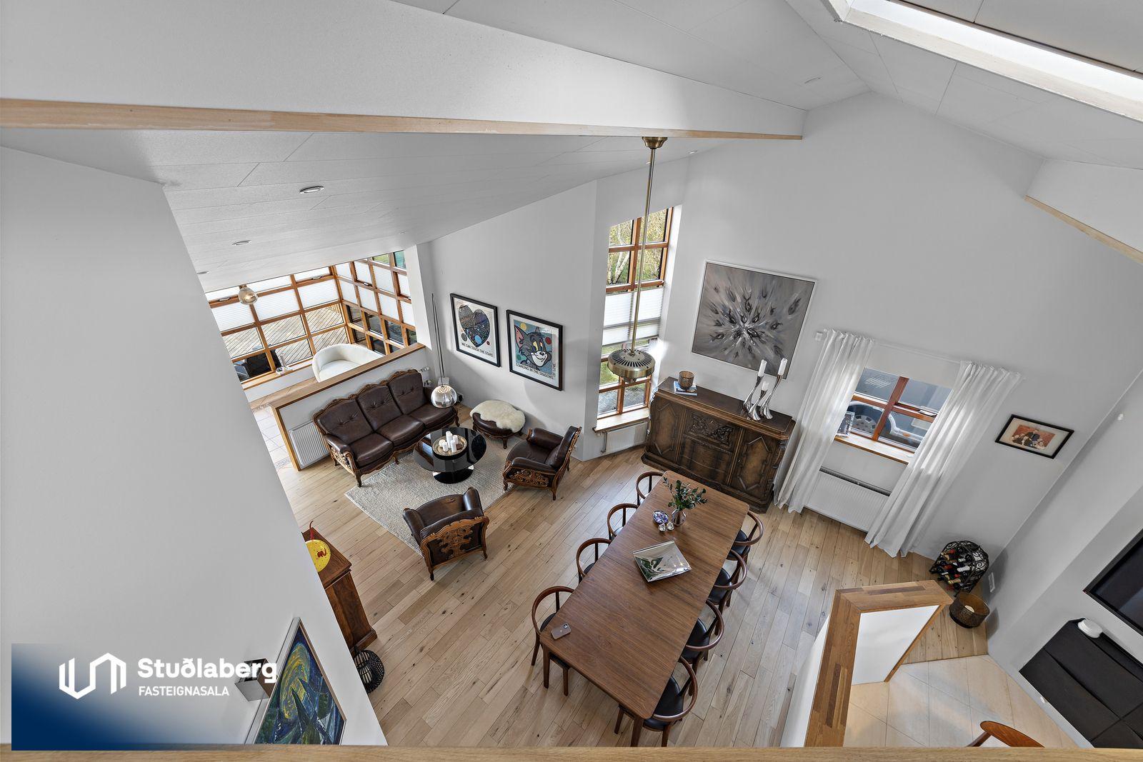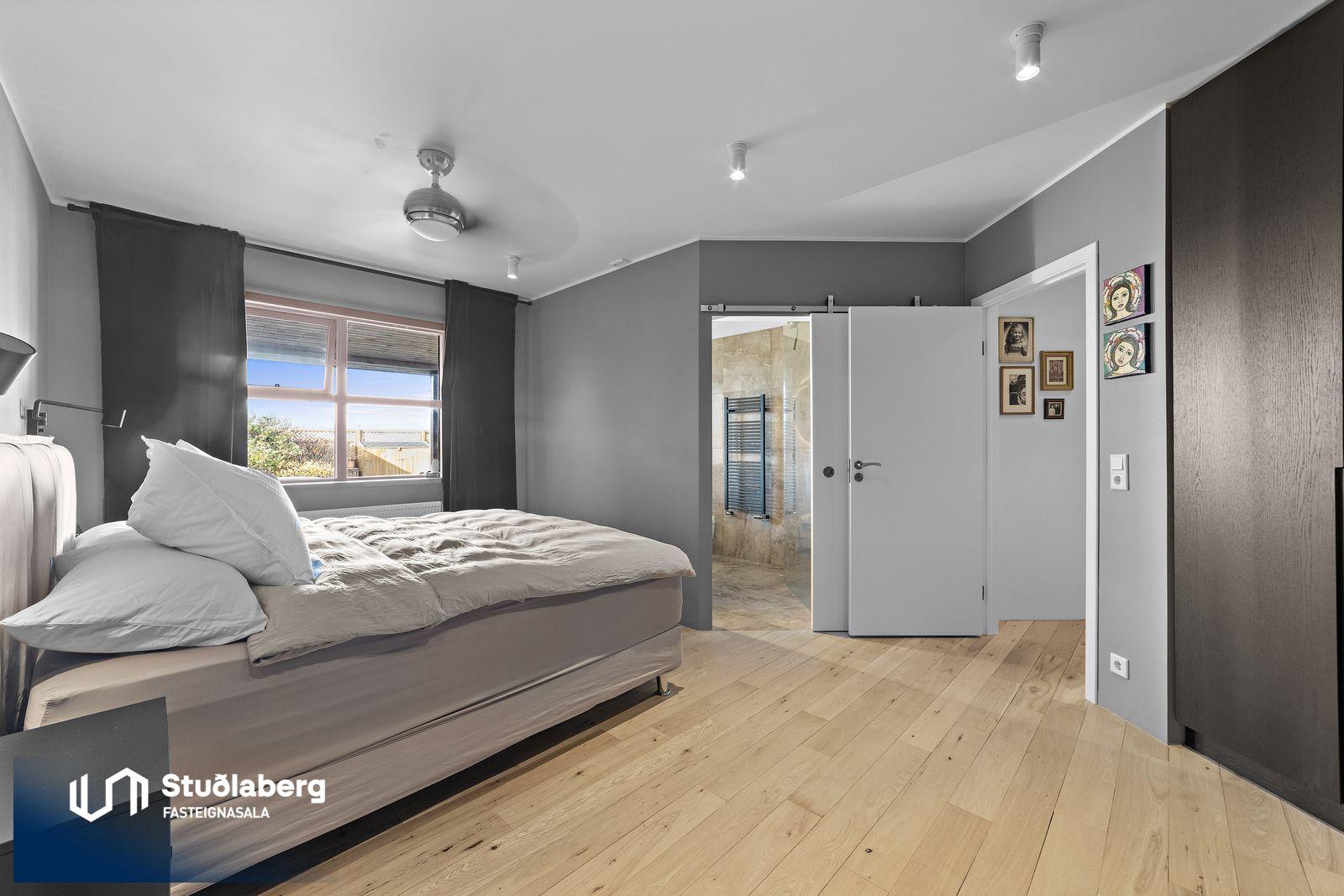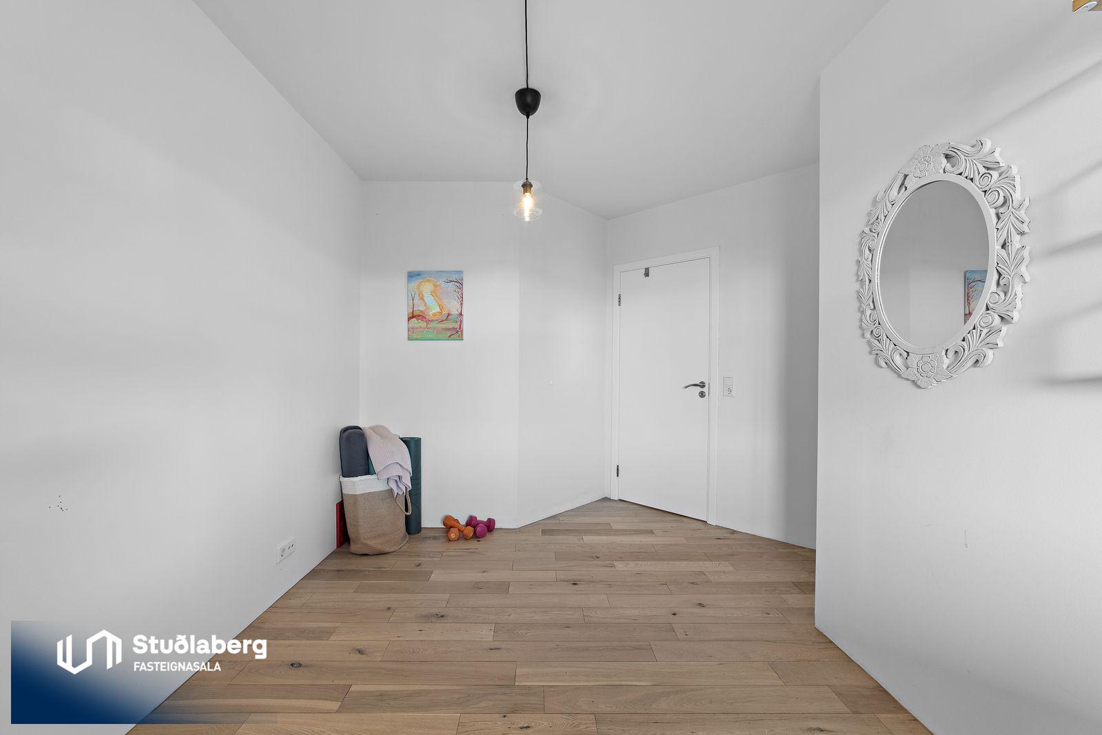 Forstofa hefur flísar á gólfi. Eldhúsið hefur flísar á gólfi og er virkilega bjart og fallegt með stórri eyju og mikið skápapláss. Inn af eldhúsinu er þvottahús. Þaðan er útgengt á lóð. Stofa hefur parket á gólfi er björt og rúmgóð, Inn af stofunni er hlýleg og björt sólstofa sem hefur flísar á gólfi og útgengt á afgirta verönd með heitum potti. Í miðrými er 30m2 efrihæð sem er ekki skráð þar eru opnanlegir þakgluggar. þar er eitt svefnherbergi. Baðherbergi hefur flísar á gólfi, baðkar ,upphengt salernig og góða innréttingu. Svefnherbergin eru fjögur og hafa parket á gólfum. Innaf hjónaherbergi er salerni og þaðan útgengt á verönd. Bílskúr er rúmgóður með flísum á gólfi og góðu skápaplássi. Geymsluloft er í bílskúr.