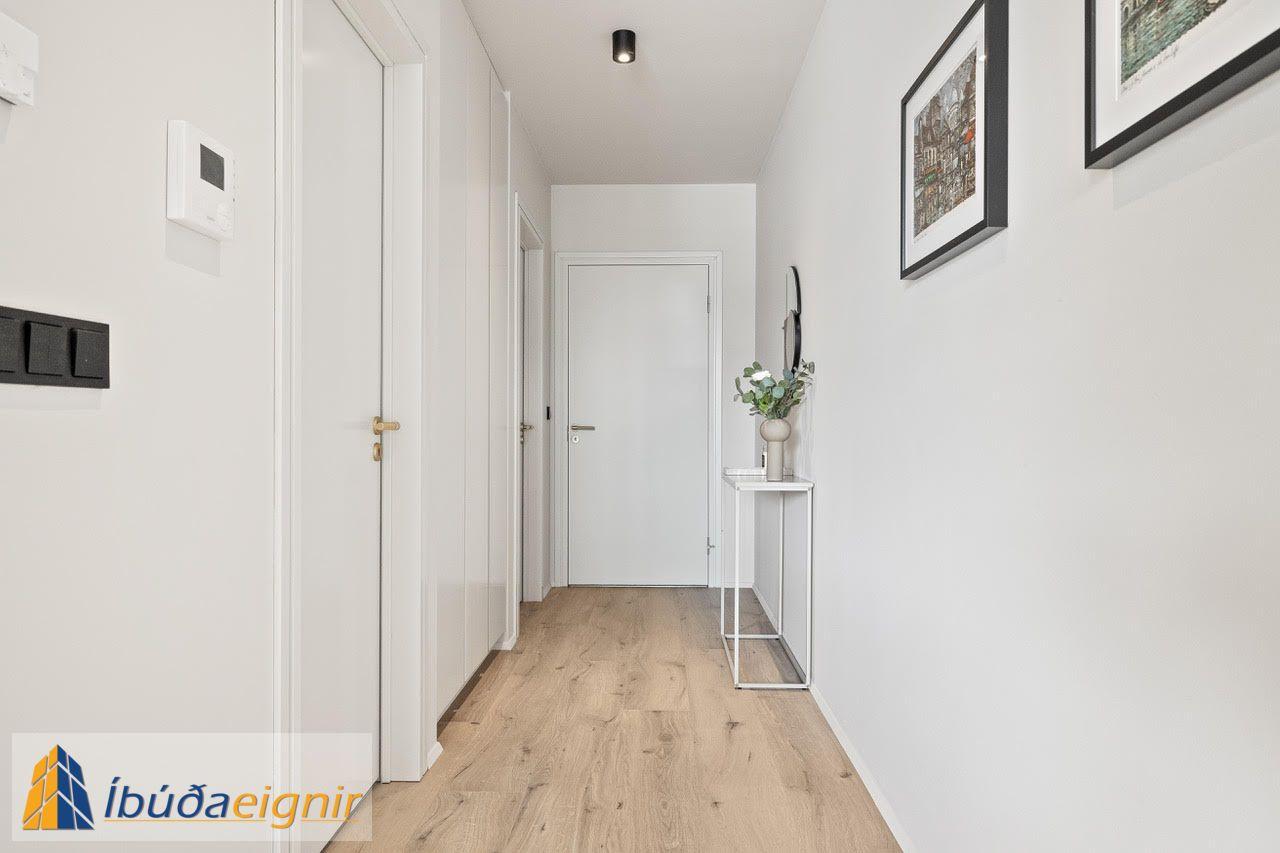 Nánari lýsing:Gengið er inn í forstofu, á hægri hönd er rúmgott svefnherbergi með stórum fataskáp. Baðherbergi er nýuppgert með fallegum flísum á gólfi og veggjum, ljósri innréttingu og nýjum blöndunartækjum. Eldhús og stofa/borðstofa eru samliggjandi í björtu opnu rými með plankaparketi á gólfum. Eldhúsið er með innbyggðum ísskáp og uppþvottavél, auk fallegrar eyju með granítborðplötum, sem skapar opið og notalegt rými. Mjög gott skápa- og geymslupláss er í eldhúsi. Stórir gólfsíðir gluggar eru í stofu og stór rennihurð út á góðar svalir.