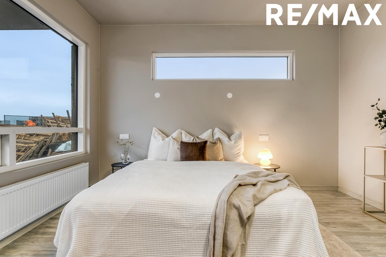 Íbúðirnar eru fjögurra herbergja, allar með stórum gluggum sem gefa mikla birtu. Íbúðirnar eru einnig allar með sér inngangi og íbúðum á neðri hæð fylgir sérafnotareitur en góðar svalir íbúðum efri hæðar. Allar íbúðir eru með aukinni lofthæð, innfelldri lýsingu að hluta, fallegum innréttingum, fullbúnar með gólfefnum og málaðar í hinum vinsæla 1/4 HÖR frá Slippfélaginu sem gefur hlýja tóna. Íbúðir á efri hæð eru með enn meiri lofthæð sem nemur 3 metrum!