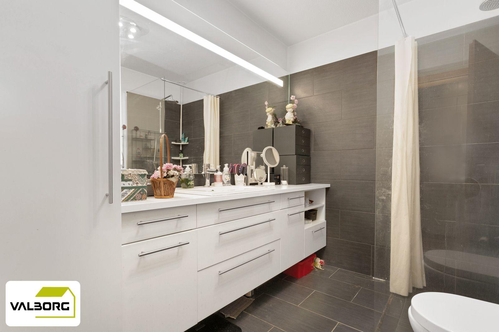 Baðherbergi: Hvít innrétting. Flísalagt og sturta.