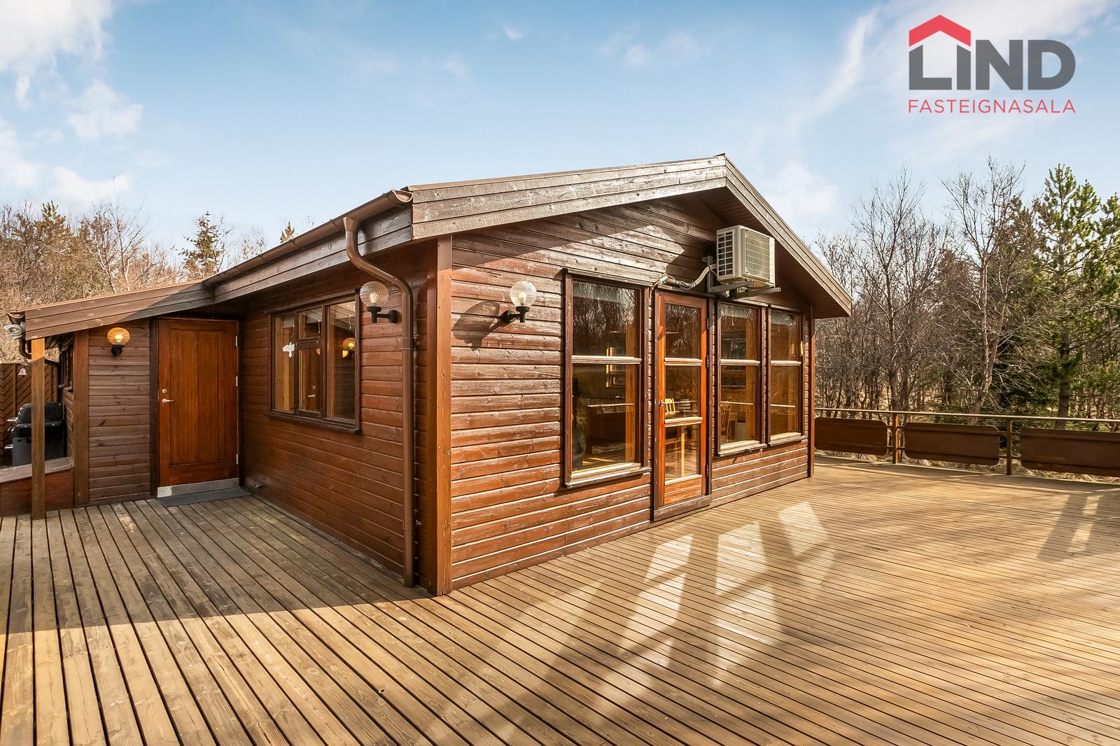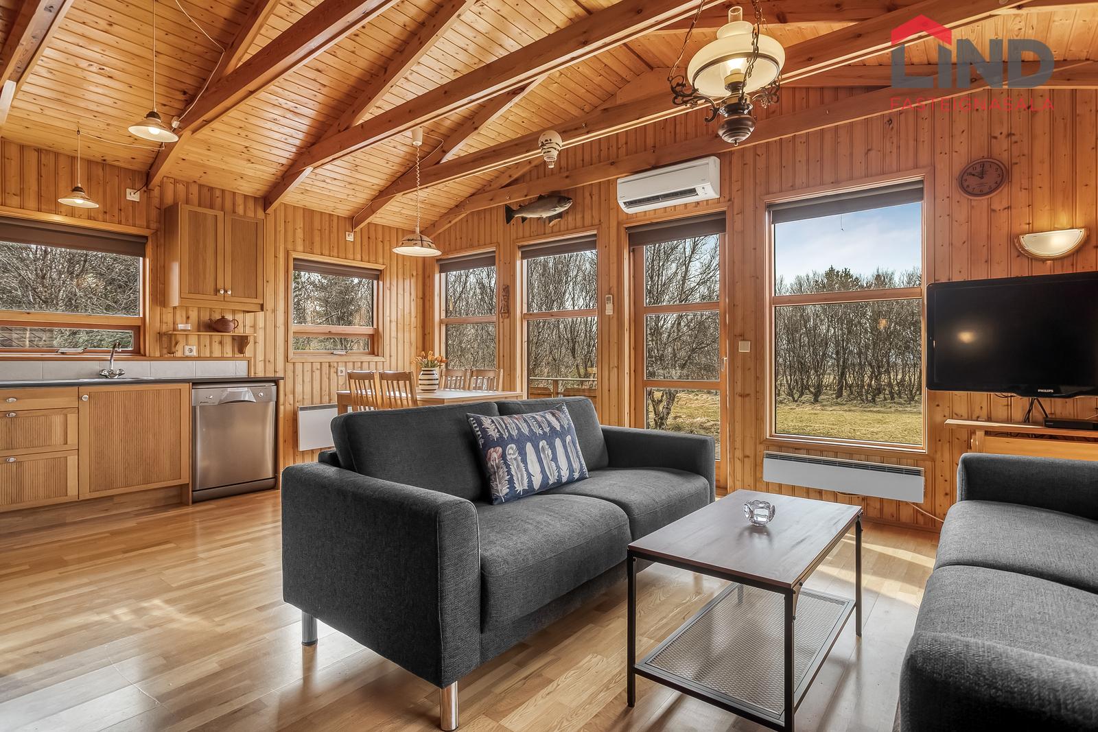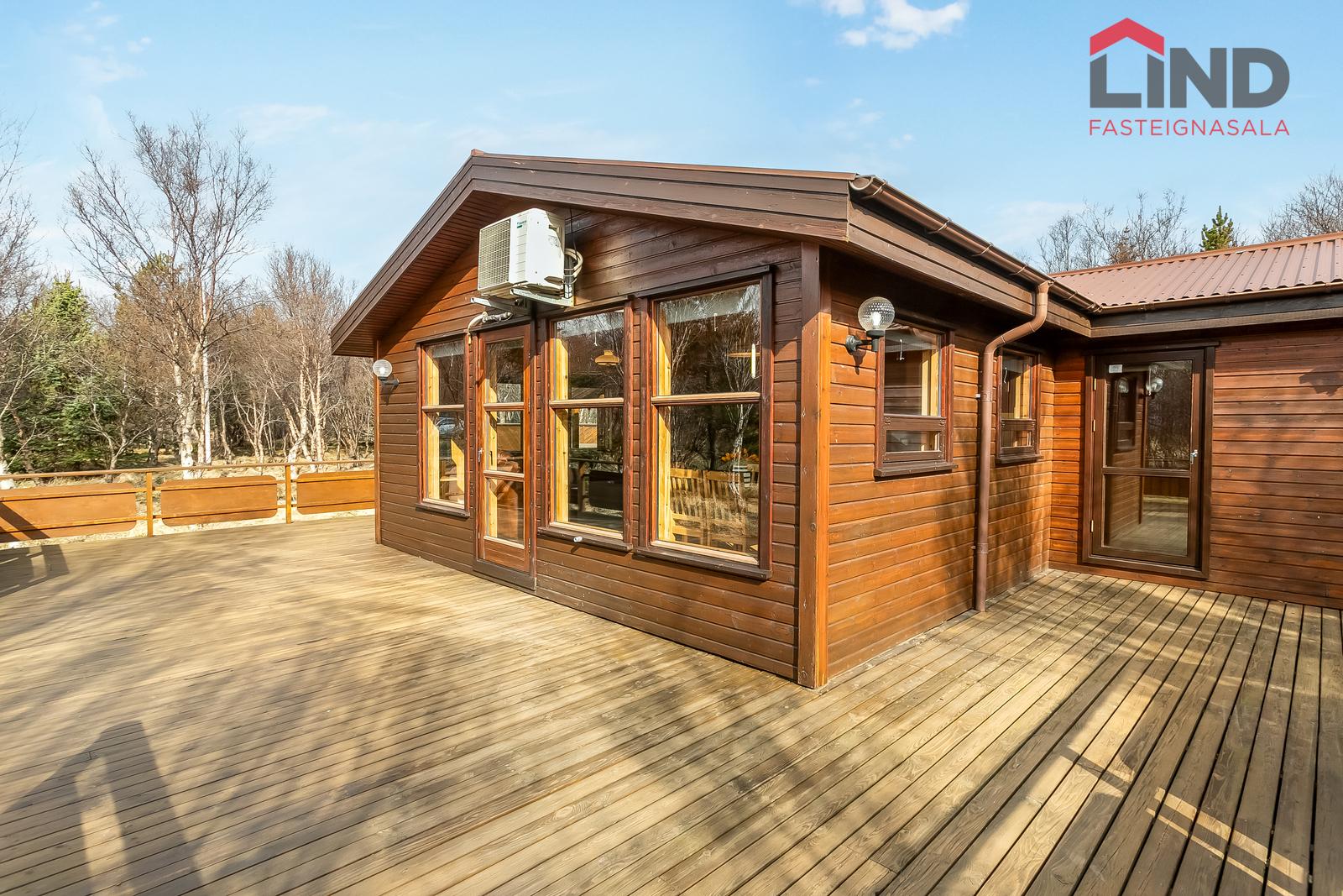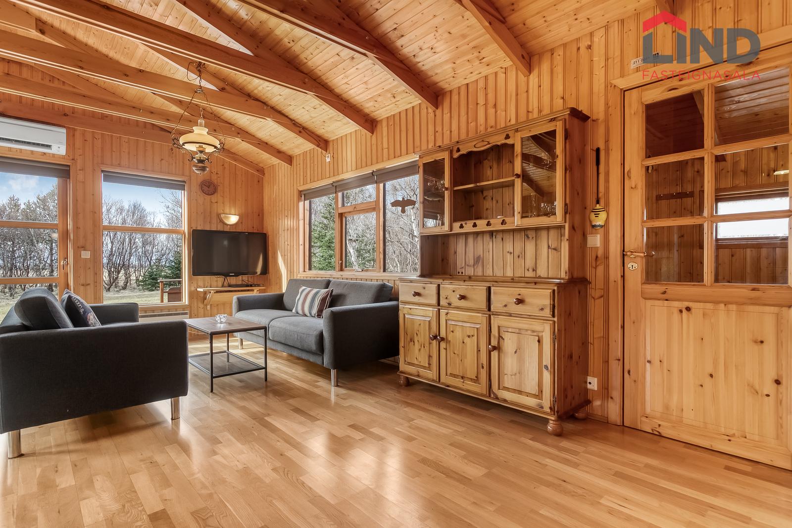 Í húsinu er Varmadæla og rafmagnsofnar í hverju rými. * Fjögur rúmgóð svefnherbergi * Tveir 4 m2 óskráðir geymsluskúrar á lóð með torfþaki * 12 fm Baðhús/geymsla á verönd með salerni / sturtubotn 80 cm, klósett og vaskur. * Leyfi er til að byggja annan bústað á lóðinni * Eldiviðargeymsla er áföst baðhúsinu úti. * Allt innbú fylgir með , fyrir utan persónulega hluti.