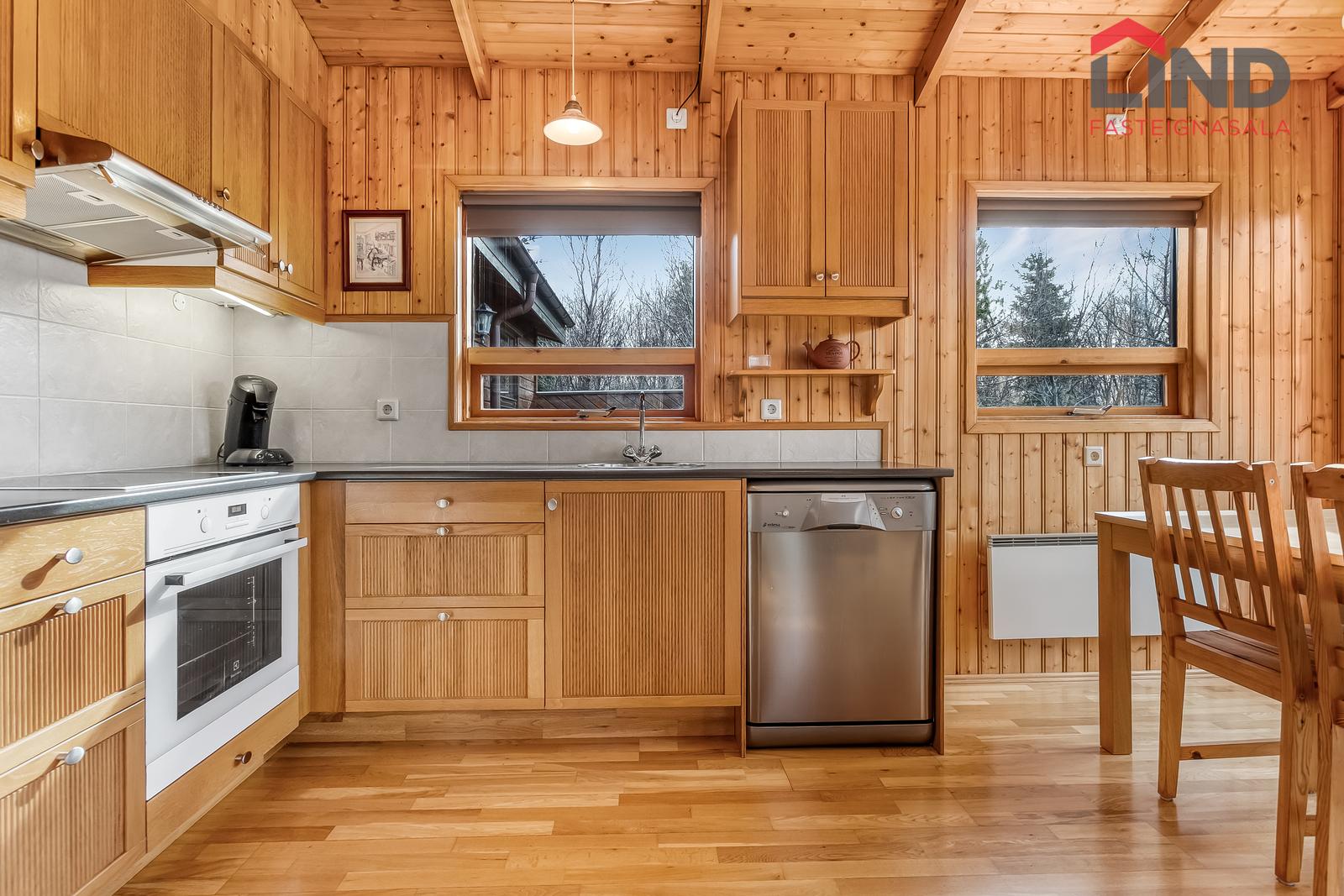 Nánari lýsing Forstofugangur er parketdúk Svefnherbergisgangur er parketlagður með útgengi út á verönd. þvottahús/geymsla er inn af forstofu með þvottaaðstöðu, hillum Eldhúsið er opið inn í stofu með fallegri innréttingu með efri og neðrii skápum þar sem gert er ráð fyrir ísskáp og uppþvottavél í innréttingu. Stofa/borðstofa er mjög rúmgóð í opnu rými með kamínu og útgengi út á stóra verönd með heitum potti. Hjónaherbergið er mjög rúmgott með parketi á gólfi Þrjú önnur rúmgóð svefnherbergi með parketi á gólfi og kojum í einu þeirra. Lagt fyrir sjónvarpi í einu herbergjanna. Baðherbergi með rúmgóðri sturtu (walk inn) og flísalögðu gólfi, góð innrétting,