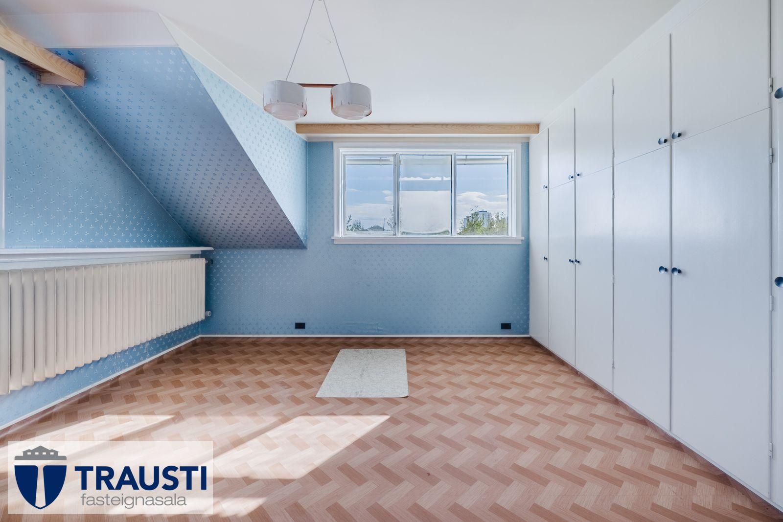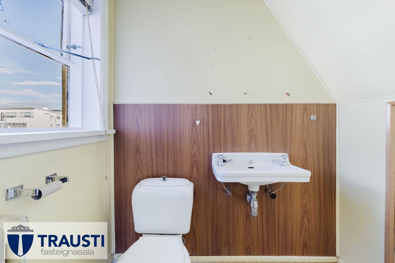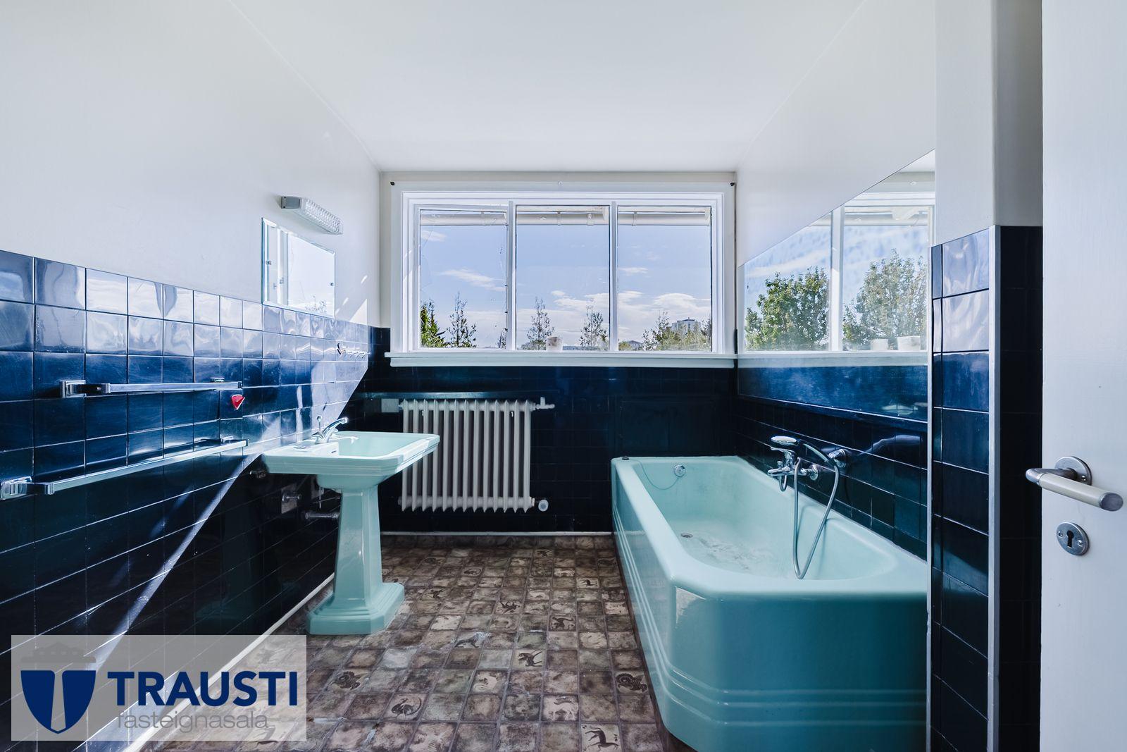Nánari lýsing eignar: Komið er inn um sérinngang og er stigi þaðan upp á hæðina þar sem komið er upp í stórt og rúmgott hol. Á aðalhæðinni er eldhús með upprunalegri innréttingu og á milli borðstofu og eldhúss er lítið búr. Stofa og borðstofa ásamt húsbóndaherbergi (merkt þannig á teikningu) snúa í suður og eru svalir út frá húsbóndaherbergi. Fallegur arinn er í dagstofunni og útgengt á svalir úr borðstofunni. Á aðalhæðinni er eitt rúmgott herbergi við hliðina á eldhúsinu. Á móti herberginu er stórt og rúmgott þvottahús. Við stigann upp á rishæðina er gestasnyrting. Gengið er upp á rishæðina úr holi og þar eru fimm rúmgóð svefnherbergi ásamt baðherbergi. Gengið er út á stórar svalir úr einu herbergjanna. Á rishæðinni er lítil geymsla við stigaopið niður á aðalhæðina. Yfir rishæðinni er háaloft sem hægt er að nýta. Í kjallara er sér geymsla sem er skráð 7,6 fm. Hægt er að leggja tveim bílum við húsið að framanverðu.