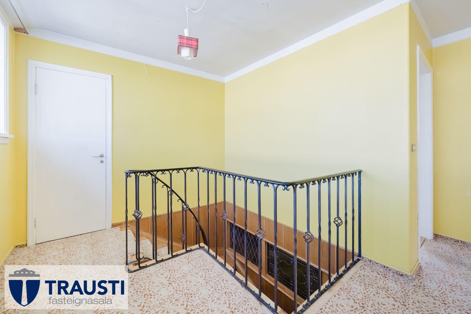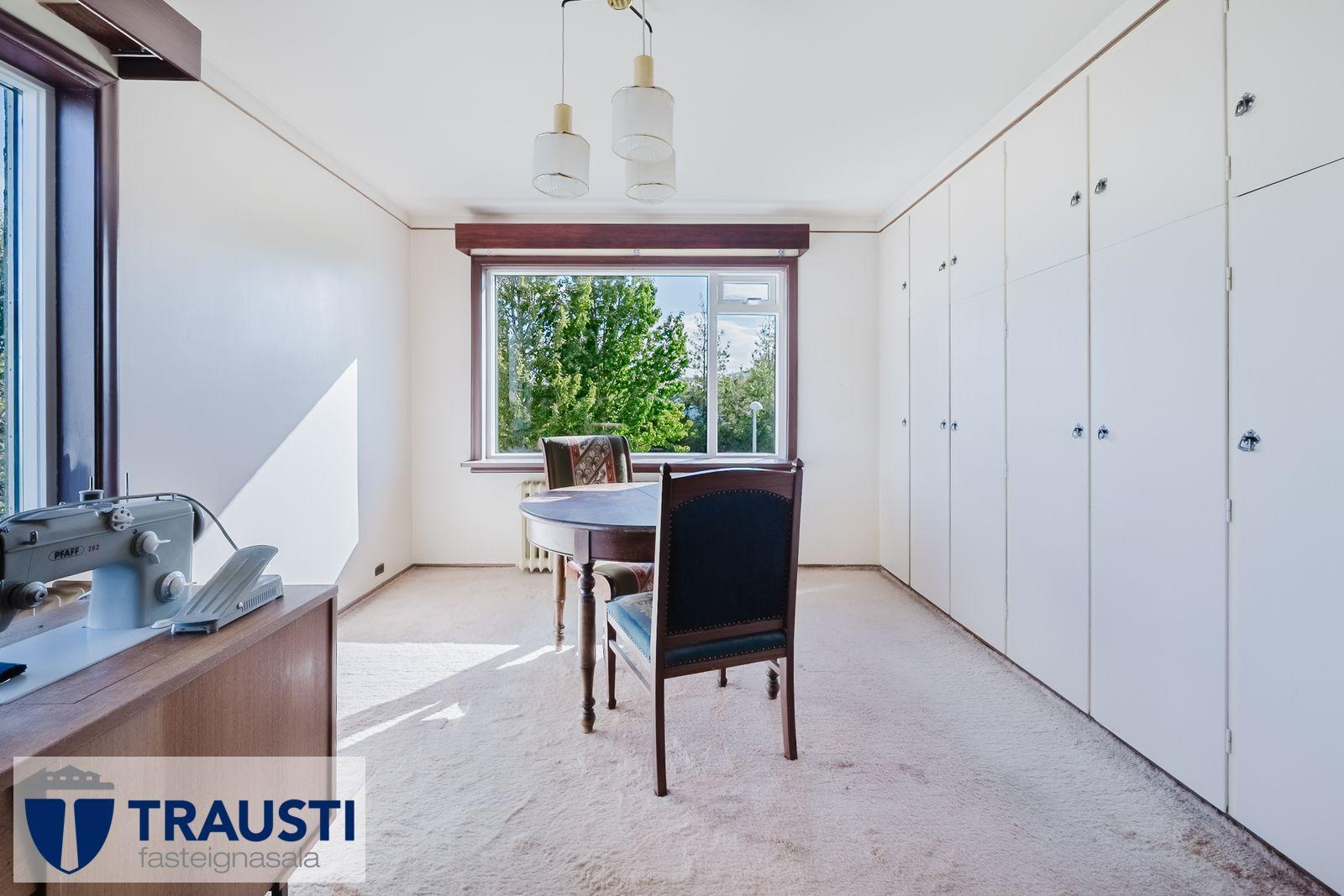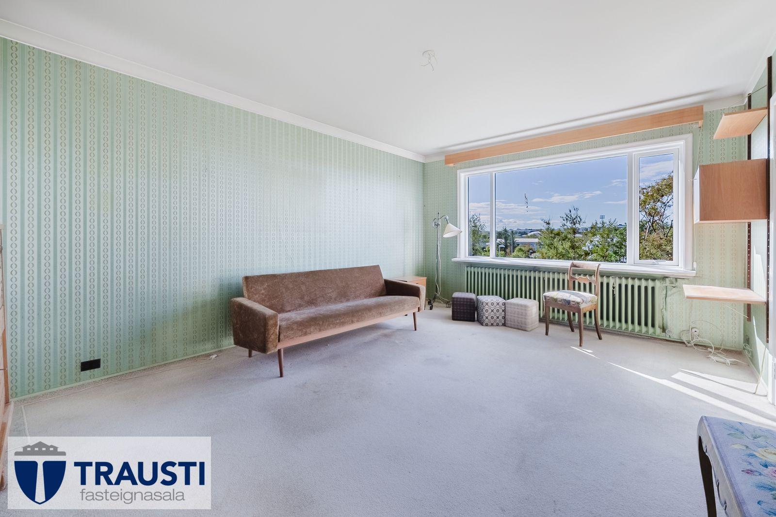 Nánari lýsing eignar: Komið er inn um sérinngang og er stigi þaðan upp á hæðina þar sem komið er upp í stórt og rúmgott hol. Á aðalhæðinni er eldhús með upprunalegri innréttingu og á milli borðstofu og eldhúss er lítið búr. Stofa og borðstofa ásamt húsbóndaherbergi (merkt þannig á teikningu) snúa í suður og eru svalir út frá húsbóndaherbergi. Fallegur arinn er í dagstofunni og útgengt á svalir úr borðstofunni. Á aðalhæðinni er eitt rúmgott herbergi við hliðina á eldhúsinu. Á móti herberginu er stórt og rúmgott þvottahús. Við stigann upp á rishæðina er gestasnyrting. Gengið er upp á rishæðina úr holi og þar eru fimm rúmgóð svefnherbergi ásamt baðherbergi. Gengið er út á stórar svalir úr einu herbergjanna. Á rishæðinni er lítil geymsla við stigaopið niður á aðalhæðina. Yfir rishæðinni er háaloft sem hægt er að nýta. Í kjallara er sér geymsla sem er skráð 7,6 fm. Hægt er að leggja tveim bílum við húsið að framanverðu.