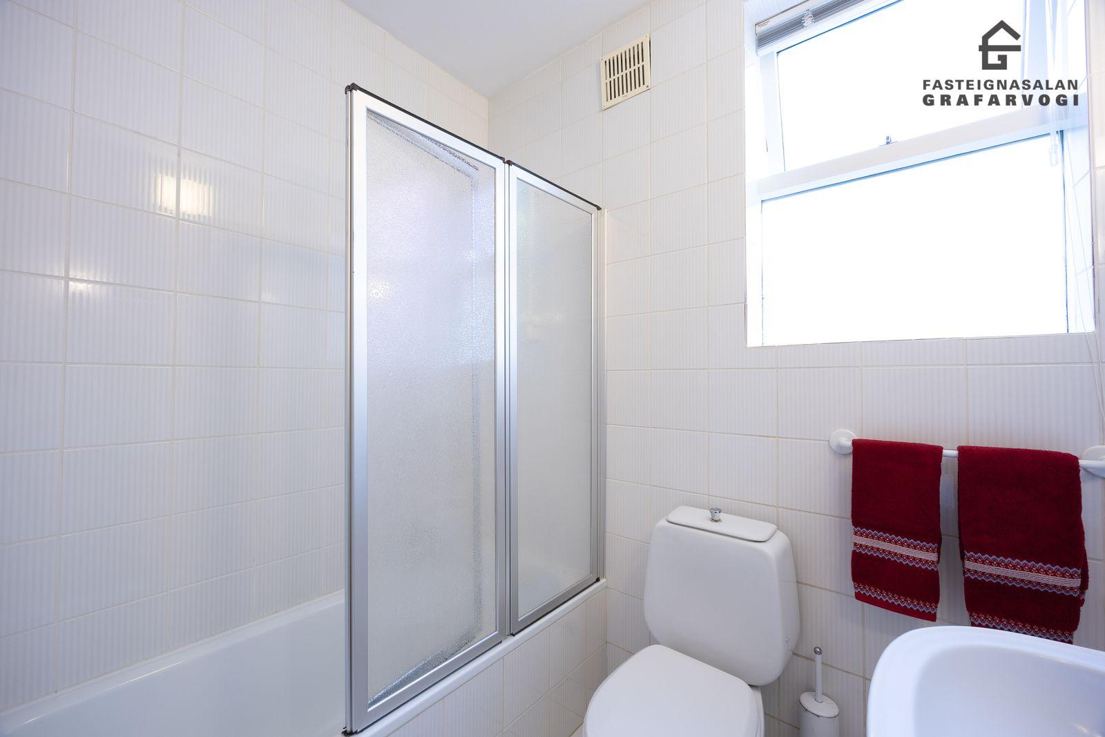 Á hæðinni eru tvö rúmgóð svefnherbergi, geymsla og baðherbergi með sturtu. Mögulegt væri að búa til auka íbúð á hæðinni.