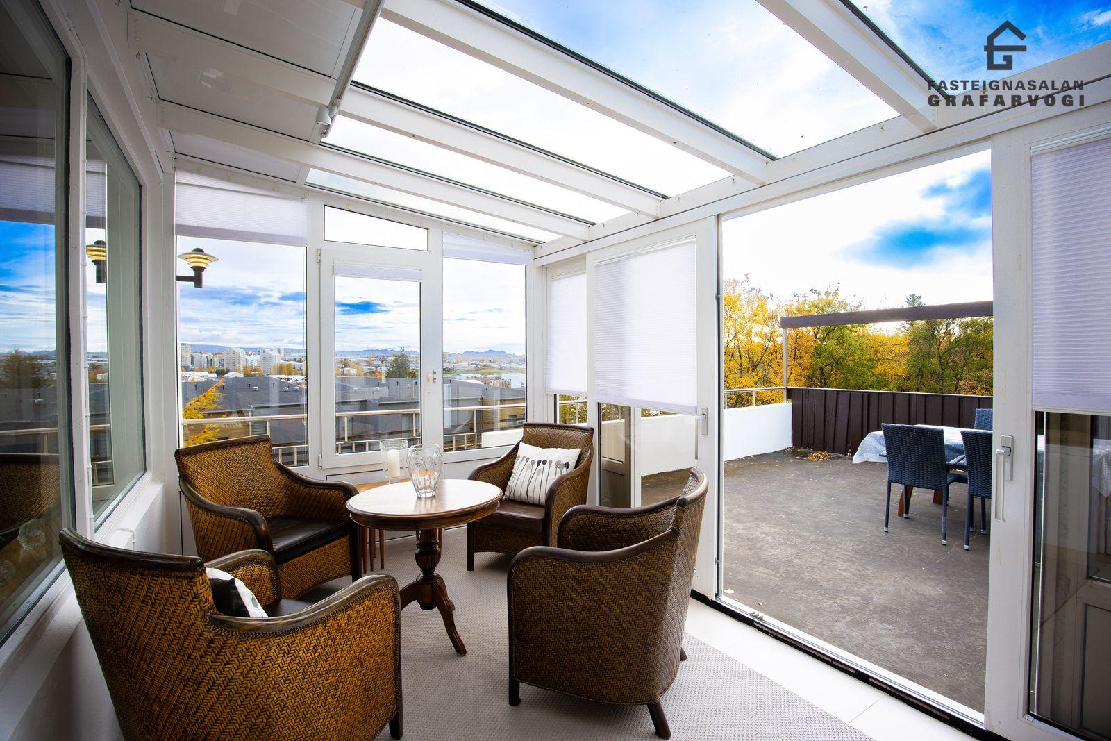 Úr stofunni er innangengt í stóra sólstofu og þaðan er útgengt út á stórar svalir sem ná yfir allt bílskúrsþakið.