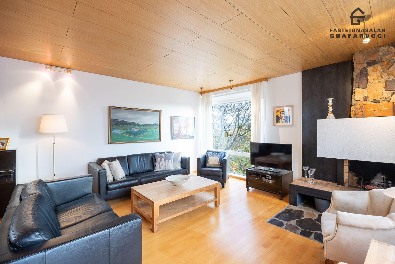 Stofan er einstaklega rúmgóð með stórum gluggum og frábæru útsýni. Fallegur arin sem er klæddur með drápuhlíðargrjóti er í stofunni.
