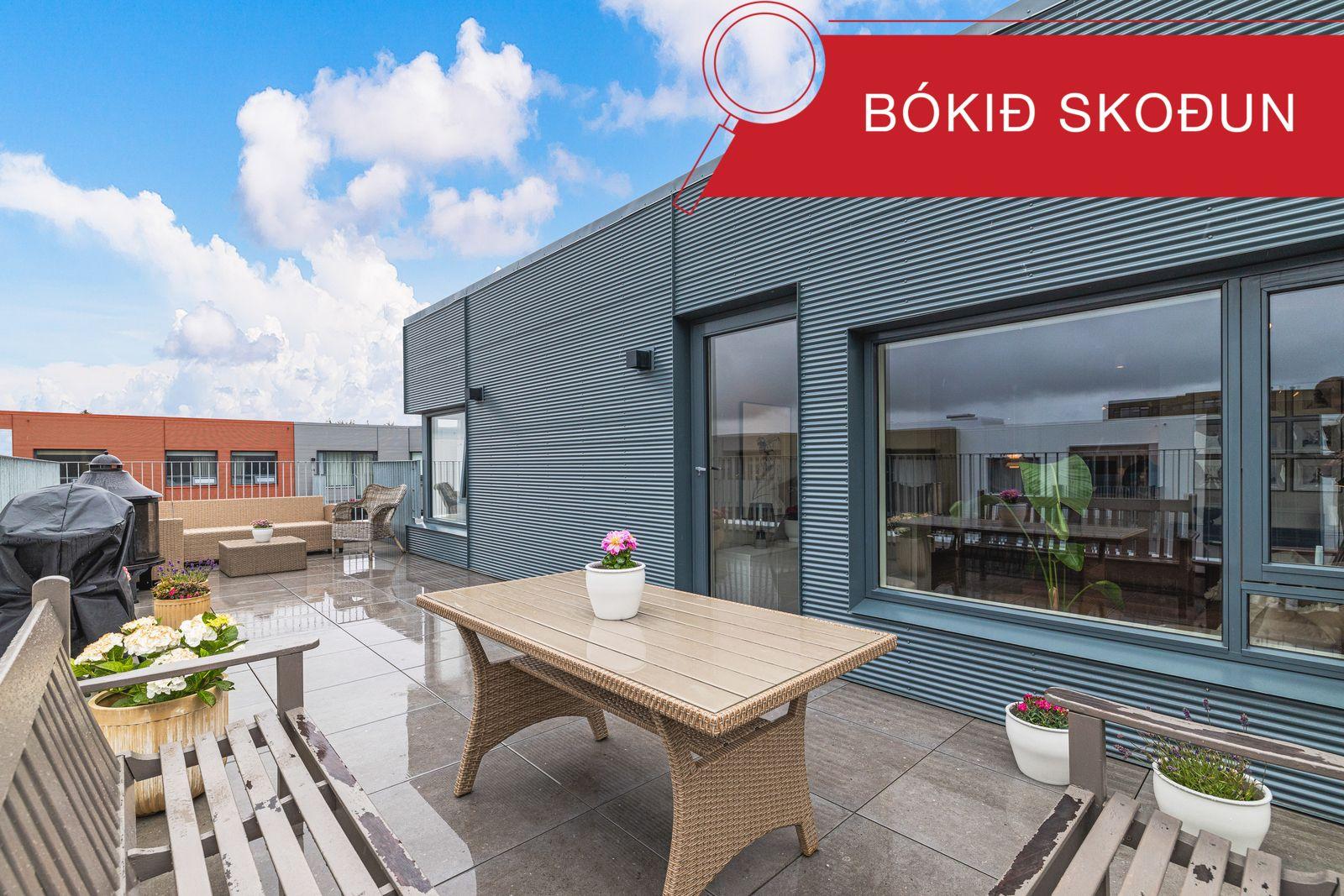 Alrými - eldhús/borðstofa/stofa: Bjart og rúmgott alrými. Í eldhúsi er falleg og vönduð sérsmíðuð innrétting og eldhúseyja með vínkæli mjög gott skápa og vinnupláss, ljúflokun á skúffum og skápum, innbyggð uppþvottavél, ísskápur m/frysti, spanhelluborð, vifta. Öll tæki eru frá AEG. Borðplata á innréttingu er svört á lit er frá Egger. Borðplata á eldhúseyju er Kvartzít steinn. Harðparket á gólfi. Úr alrými er gengið bæði út á svalir 3 m2 og úr stofu er gengið út á 33,7 m2 þaksvalir, möguleiki á að setja heitan pott á þaksvalir vatnskrani og affall er til staðar á svölum.
