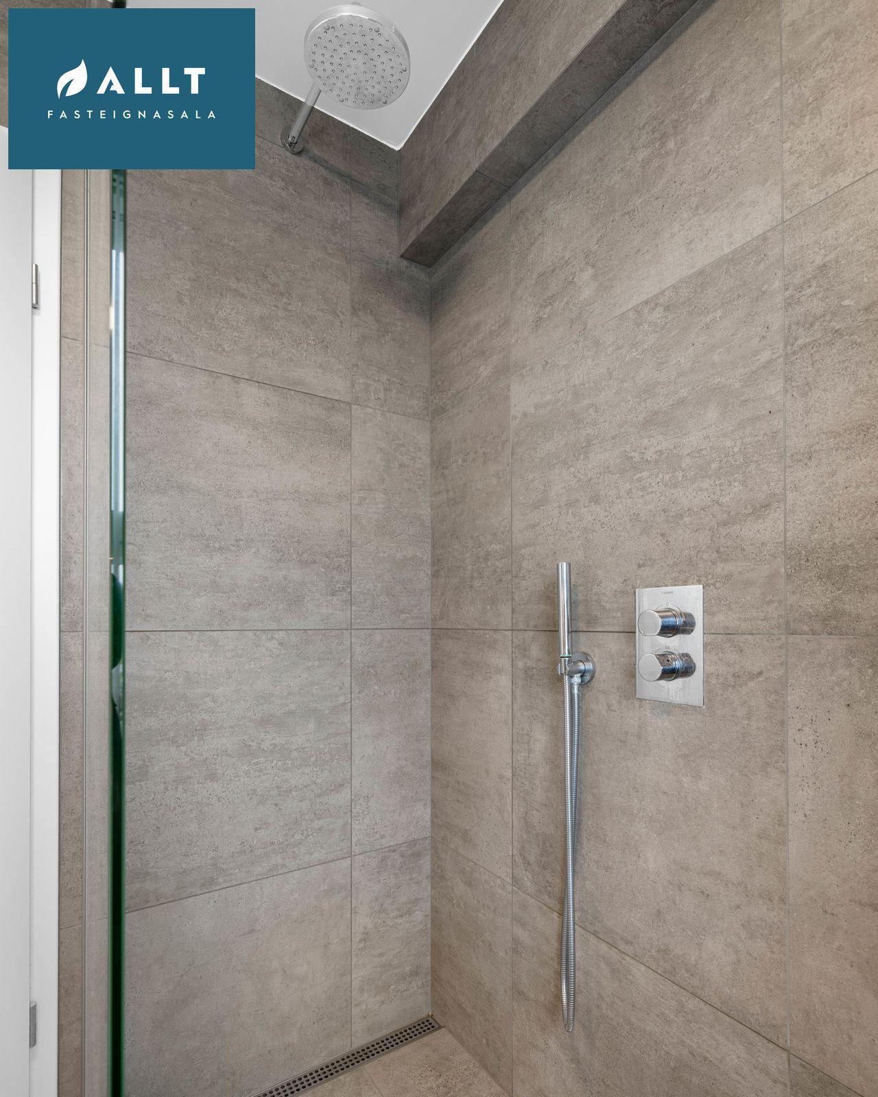 Baðherbergi: Fallega endurnýjað baðherbergi. Flísalagt í hólf og gólf með steingráum flísum, sérhannaðari innréttingu með skúffum, vask og sérsmíðuðum bekk frá Fanntofell, skápum með speglafrontum, upphengt klósett, flísalögðum sturtubotni með sturtuhlið úr gleri og handklæðaofn. Blöndunartæki frá Tengi eru við handlaug og innfelld tæki í vegg við sturtu.