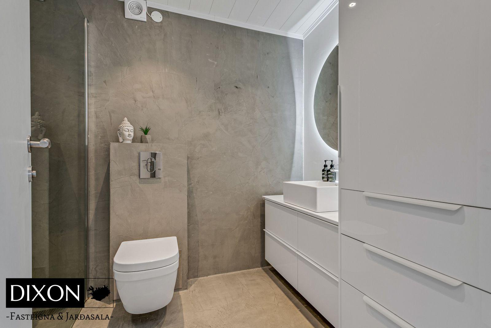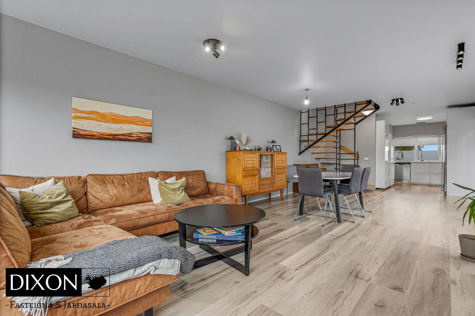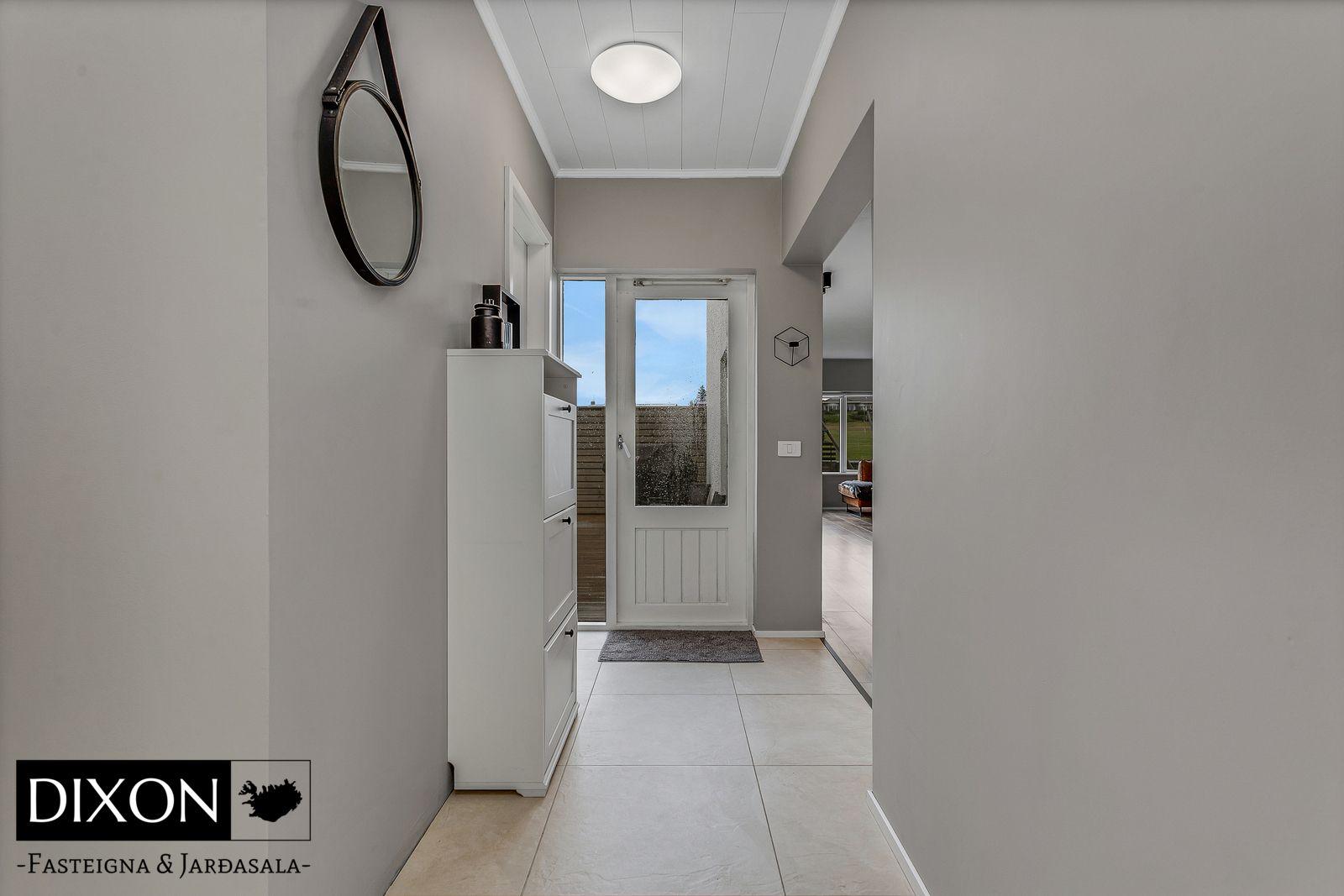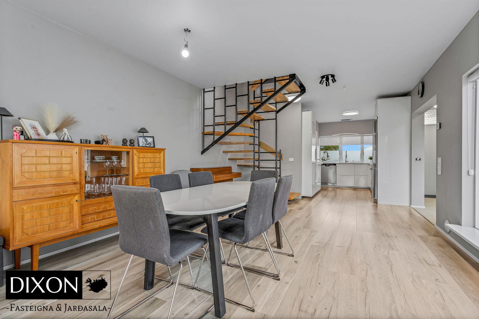 Lýsing á eign; Gengið er inn í flísalagða forstofu, innbyggðir skápar með rennihurð eru á vinstri hönd þegar að inn er komið. Þar fyrir innan er svo gesta salerni með upphengdu salerni, Walk in sturtu og handlaug. Forstofu herbergi er á neðri hæð með harðparketi á gólfi. Útgengt er á sólpall frá holi. Nýlegt eldhús með hvítri innréttingu og nægu skápaplássi. Þvottahús er inn af eldhúsi. Hægt er að ganga út á plan frá þvottahúsi. Stofan er opin og björt, stórir gluggar og fallegt harðparket er á allri neðri hæðinni að frátöldu votrými. Skipt var um þrepinn í stiga sem leiðir þig upp á efri hæð hússins. Efri hæðin; Þegar að upp er komið eru þar 2 barnaherbergi á vinstri hönd, stórir gluggar og harðparket er á gólfum. Baðherbergið er sérlega fallegt, veggir eru múraðir, gólfið er flísalagt. Walk in sturta, upphengt salerni og rúmgóð innrétting með handlaug. Hjónaherbergið er mjög rúmgott, harðparket er á gólfi ásamt stórum fataskáp og fataherbergi. Rúmgott hol er fyrir framan hjónaherbergið sem nýta má sem leikhorn eða skrifstofurými. Útgengt er á stórar þaksvalir frá efri hæðinni. Svalahurð út á þaksvalir var endurnýjuð. Bílskúrinn er með nýlegri bílskúrshurð með opanara. Bílskúrinn er flísalagður einnig með hita í gólfi. Gert er ráð fyrir vask í bílskúr, einnig er gert ráð fyrir heitum potti sem búið er að leggja fyrir undir sólpallinn. Útgengt er frá bílskúr út á baklóð á nýlegan sólpall sem er við húsið. Rafmagnstafla var færð út í bílskúr til að koma fyrir sturtu á gesta baðherberginu á neðri hæð hússins. Nýlegur sólpallur er á milli hússins og bílskúrs, hægt er að loka pallinum frá garðinum með hliði. Gert er ráð fyrir heitum potti á sólpalli, allar lagnir eru til staðar.