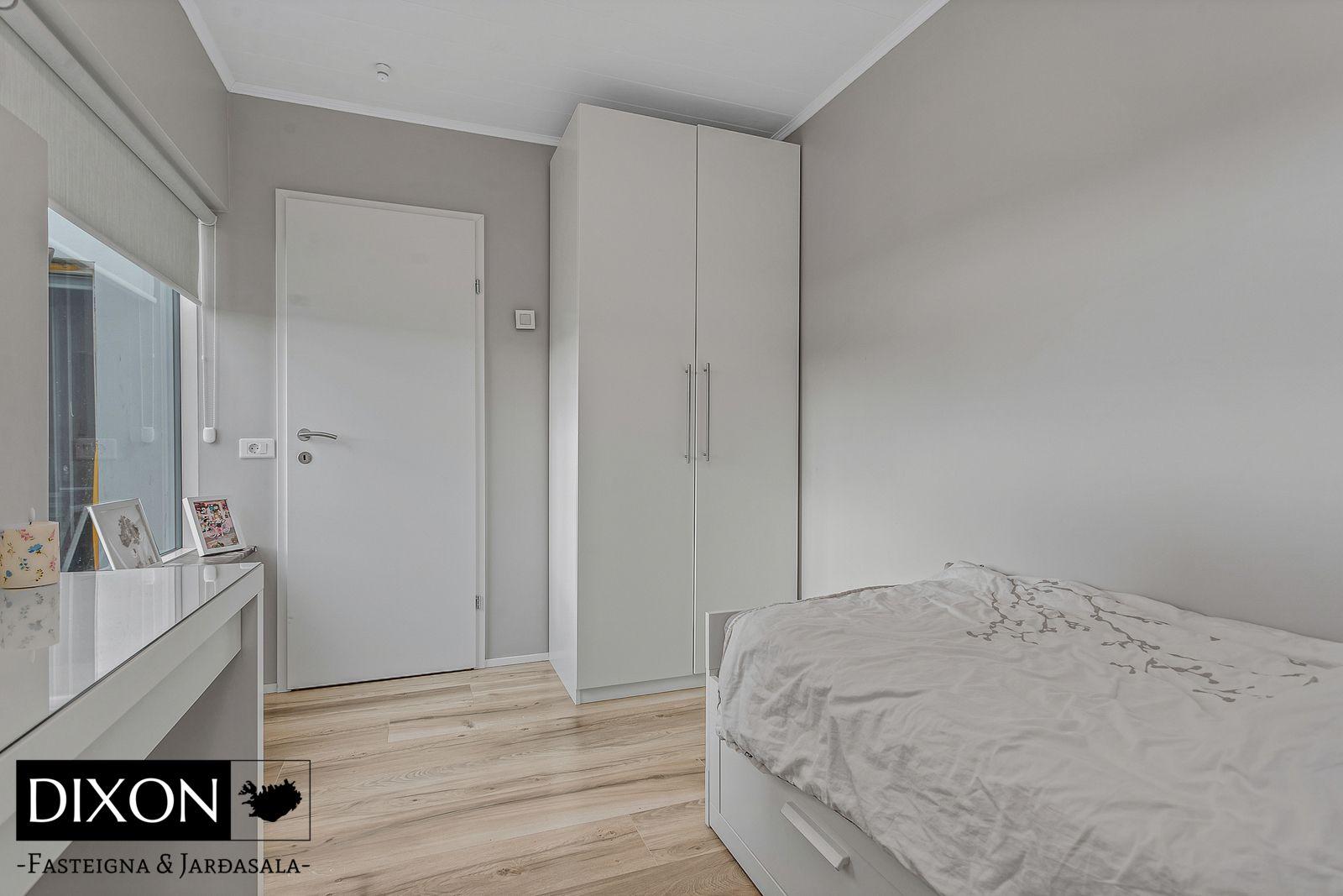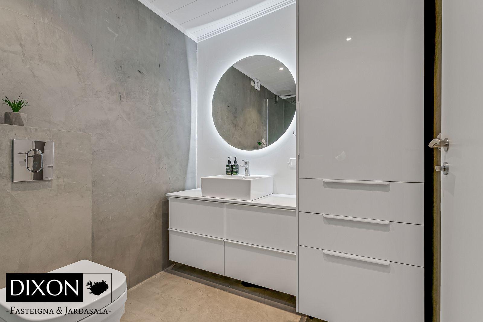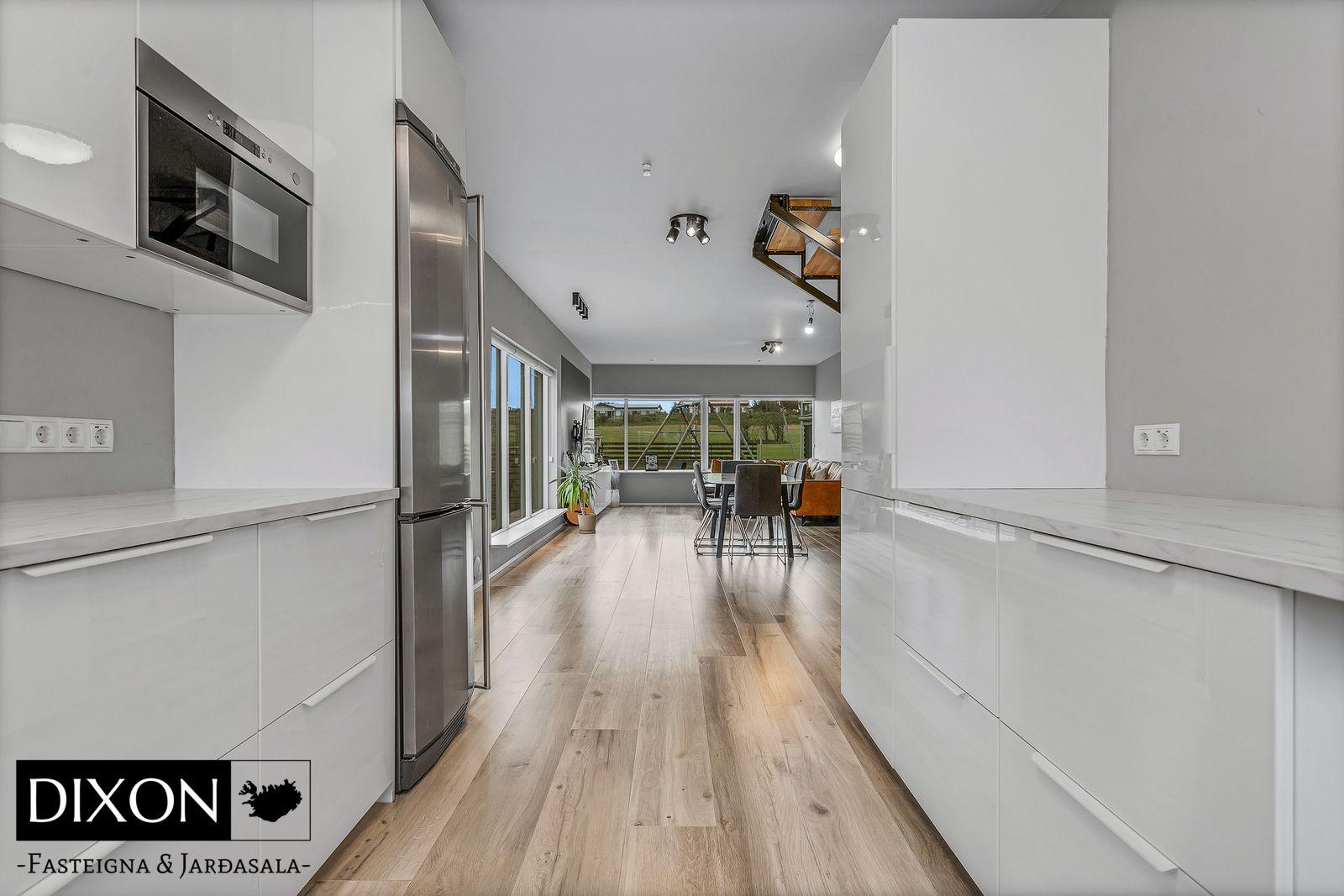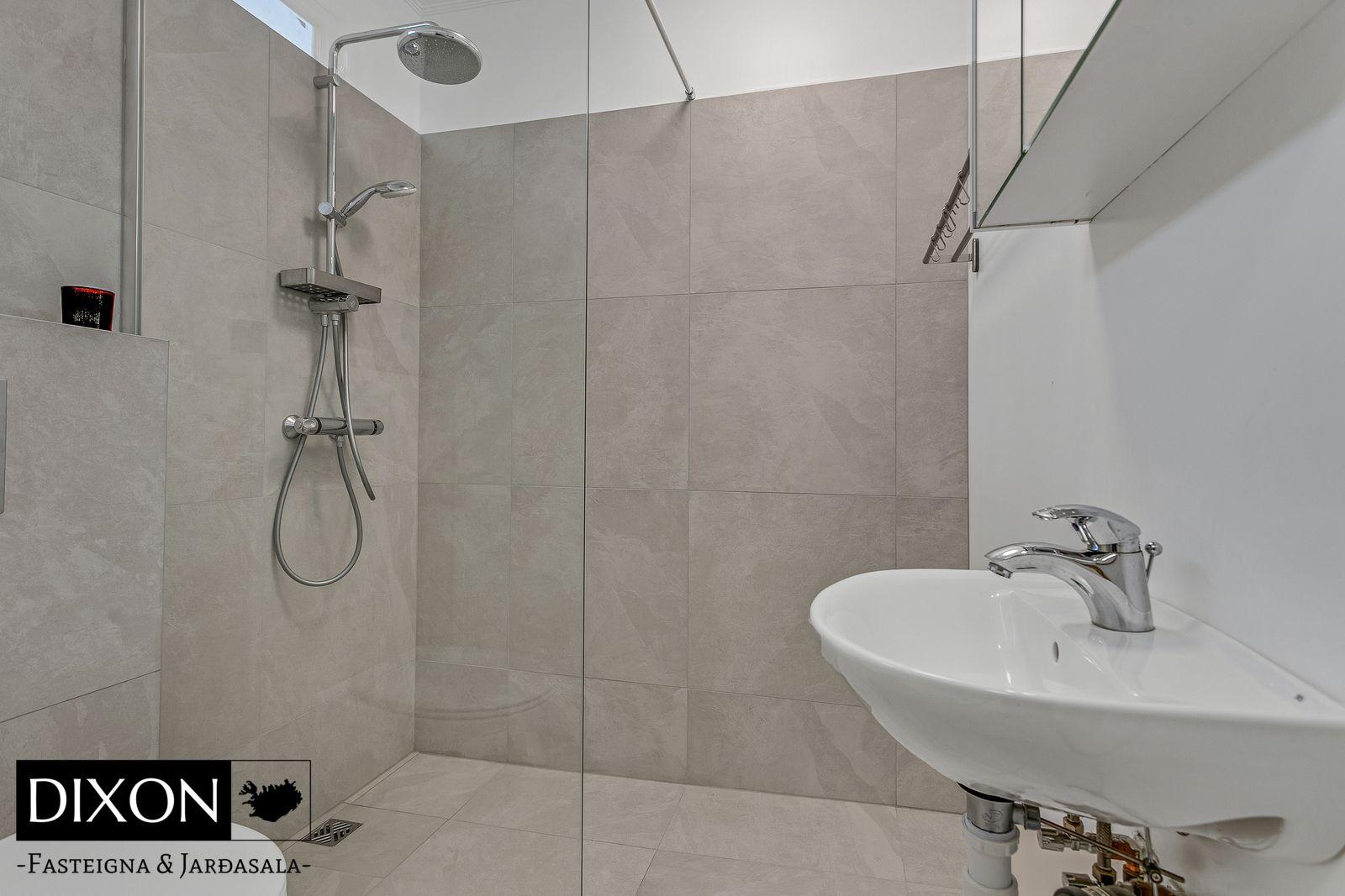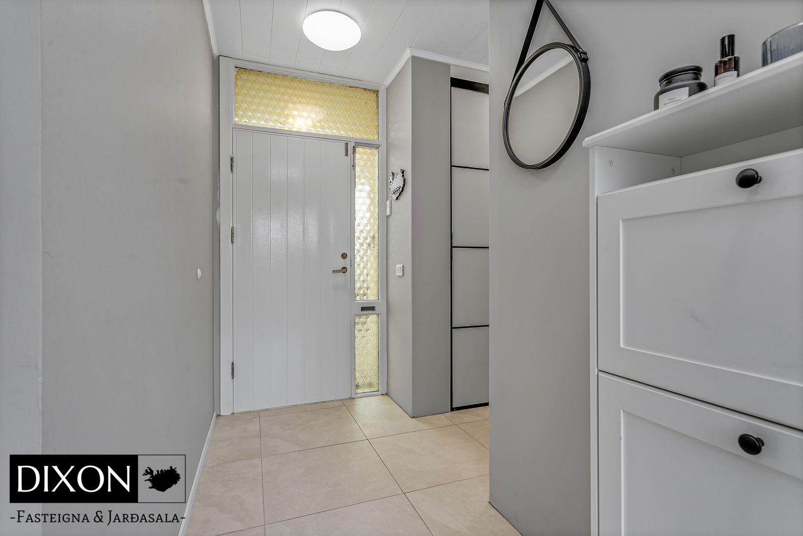 Lýsing á eign; Gengið er inn í flísalagða forstofu, innbyggðir skápar með rennihurð eru á vinstri hönd þegar að inn er komið. Þar fyrir innan er svo gesta salerni með upphengdu salerni, Walk in sturtu og handlaug. Forstofu herbergi er á neðri hæð með harðparketi á gólfi. Útgengt er á sólpall frá holi. Nýlegt eldhús með hvítri innréttingu og nægu skápaplássi. Þvottahús er inn af eldhúsi. Hægt er að ganga út á plan frá þvottahúsi. Stofan er opin og björt, stórir gluggar og fallegt harðparket er á allri neðri hæðinni að frátöldu votrými. Skipt var um þrepinn í stiga sem leiðir þig upp á efri hæð hússins. Efri hæðin; Þegar að upp er komið eru þar 2 barnaherbergi á vinstri hönd, stórir gluggar og harðparket er á gólfum. Baðherbergið er sérlega fallegt, veggir eru múraðir, gólfið er flísalagt. Walk in sturta, upphengt salerni og rúmgóð innrétting með handlaug. Hjónaherbergið er mjög rúmgott, harðparket er á gólfi ásamt stórum fataskáp og fataherbergi. Rúmgott hol er fyrir framan hjónaherbergið sem nýta má sem leikhorn eða skrifstofurými. Útgengt er á stórar þaksvalir frá efri hæðinni. Svalahurð út á þaksvalir var endurnýjuð. Bílskúrinn er með nýlegri bílskúrshurð með opanara. Bílskúrinn er flísalagður einnig með hita í gólfi. Gert er ráð fyrir vask í bílskúr, einnig er gert ráð fyrir heitum potti sem búið er að leggja fyrir undir sólpallinn. Útgengt er frá bílskúr út á baklóð á nýlegan sólpall sem er við húsið. Rafmagnstafla var færð út í bílskúr til að koma fyrir sturtu á gesta baðherberginu á neðri hæð hússins. Nýlegur sólpallur er á milli hússins og bílskúrs, hægt er að loka pallinum frá garðinum með hliði. Gert er ráð fyrir heitum potti á sólpalli, allar lagnir eru til staðar.