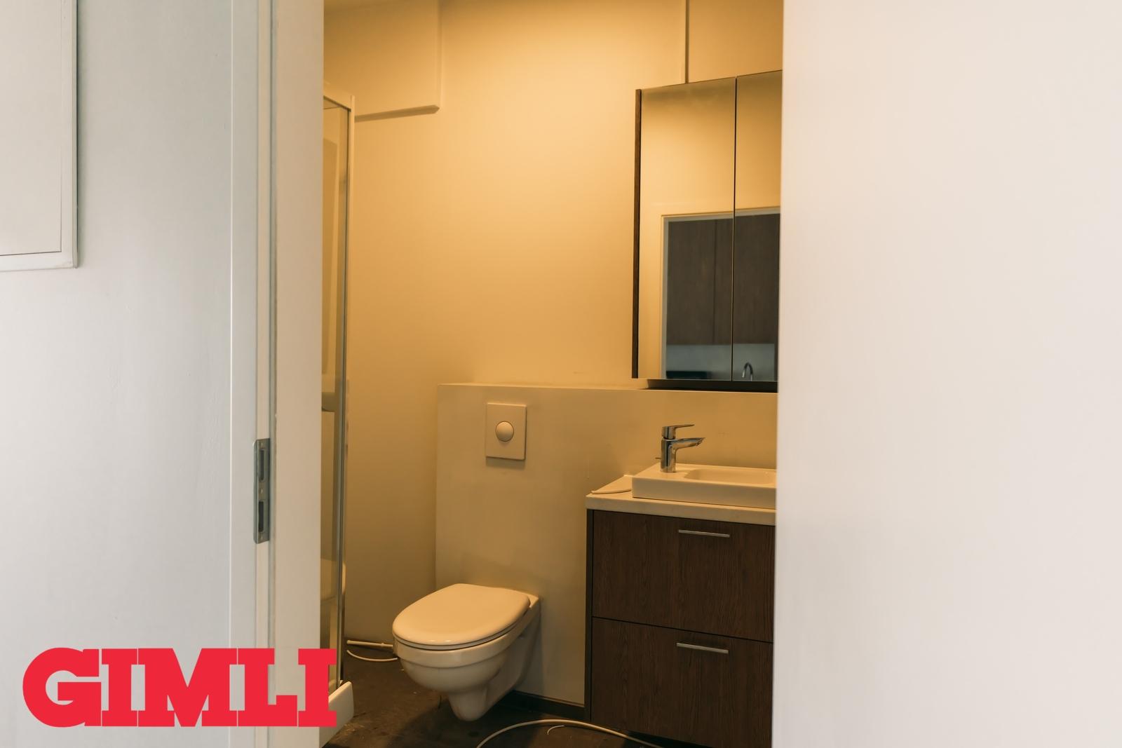 Baðherbergi: Vegghengt salerni, sérsmíðuð innrétting með ísteyptri handlaug og speglaskáp, sturtuklefi. Ljósar 60x60 flísar á gólfi. Handklæðaofn.