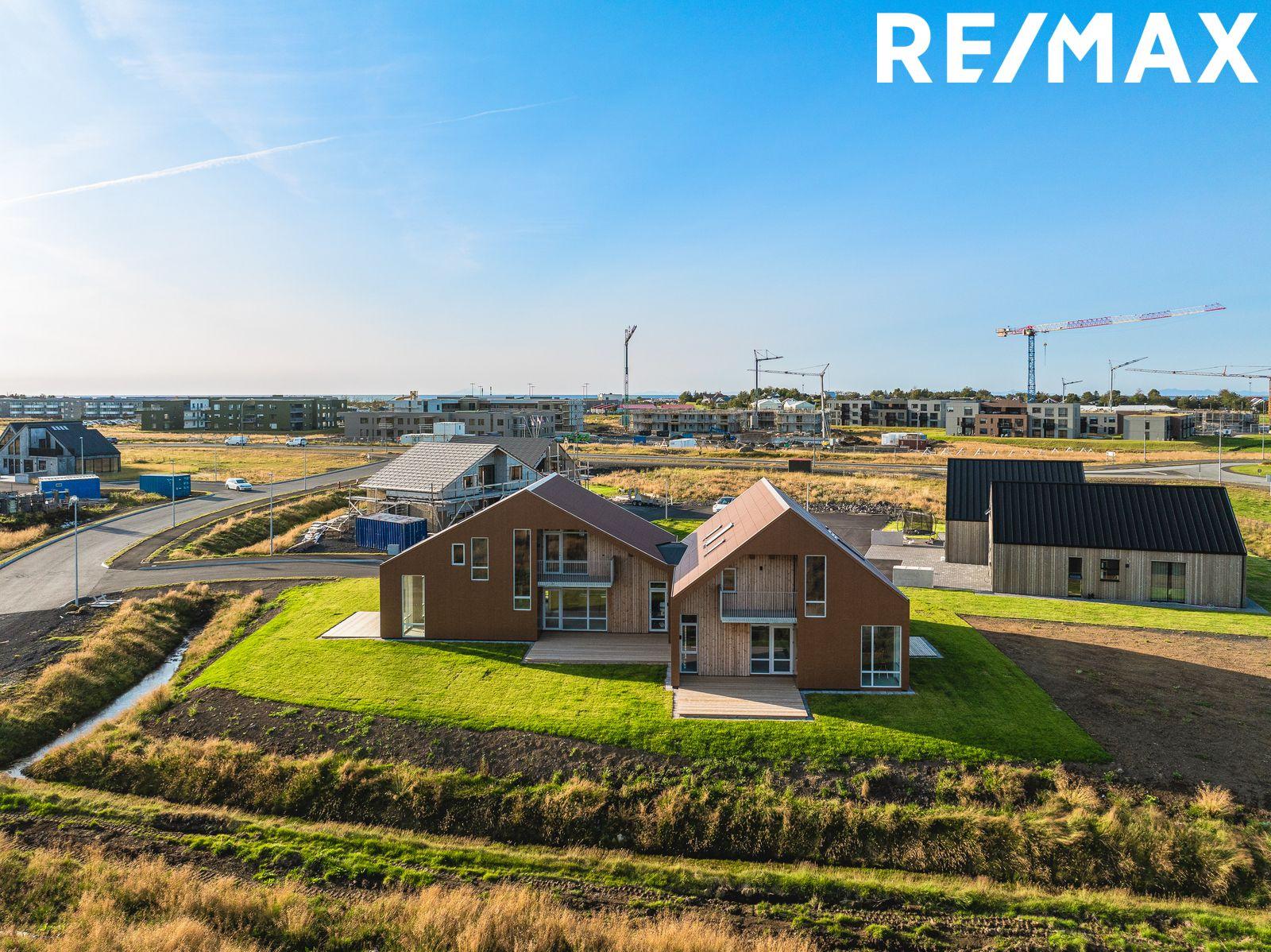 Lóðin: Lóð verður fullfrágengin samkvæmt teikningum. Viðarklæddar verandir, hellulögn með snjóbræðslulögn og lóð tyrfð með grasþökum. Forsteypt sorptunnuskýli með hurðum.