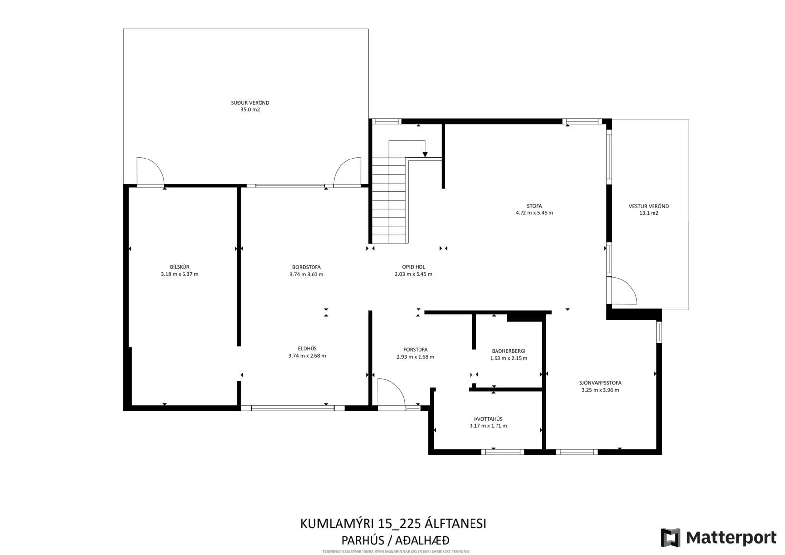77,1 fm, gólfflötur stærri.Staðsteyptur stigi er á milli hæða með glerhandriði.