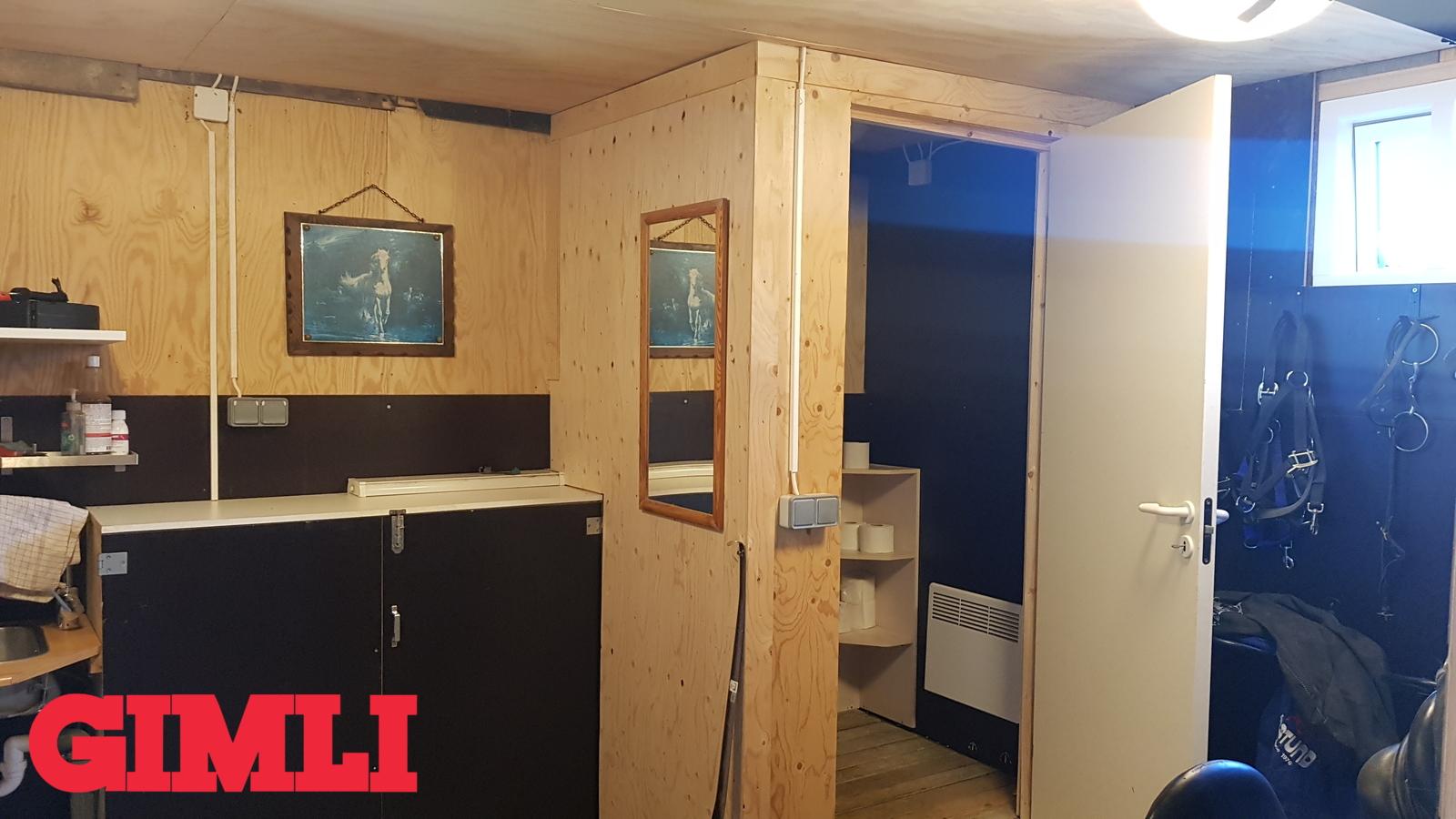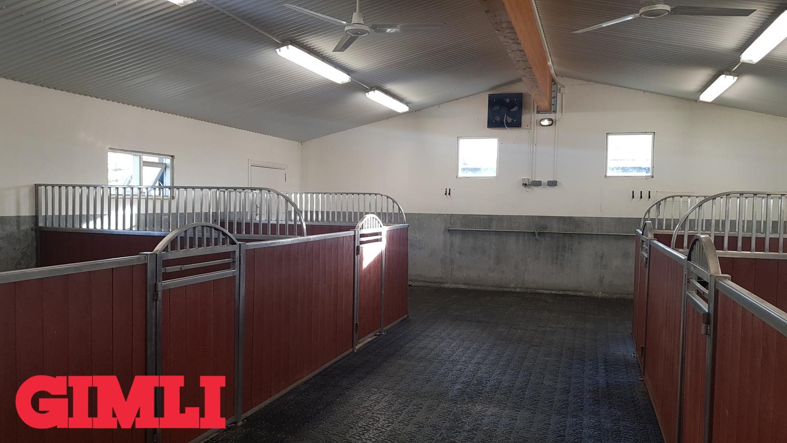 Um er að ræða nýlegt alls 185 fm hús sem er það glæsilegasta á svæðinu og þó víðar væri leitað. Allt mjög rúmgott bæði fyrir hesta og menn. Óvenju glæsileg og rúmgóð inniaðstaða. Húsið rúmar 12 hross og eru allar stíur rúmlega löglegar, þ.e. 5 stk. 9 fm tveggja hesta stíur og ein tveggja hesta graðhestastía. Milliveggir stía með harðplasti og ryðfrítt járnavirki. Hiti er í öllum stíum og eru þær safnstíur með lúgum út í taðkassa. Tvær breiðar tvískiptar hurðir út í stórt sérgerði og eru öll útihlið og rekkverk nýtt galvaniserað. Hlaðan er mjög stór og góð með tvöfaldri hurð og hárri lofthæð. Mjög rúmur gangur við inngang í húsið. Stór og góð hnakkageymsla og snyrting þar við hliðina. Stór og smekkleg kaffistofa með hvítri innréttingu og öllum tækjum,flísalagt gólf og góður borðkrókur og gluggi yfir í hesthúsið.