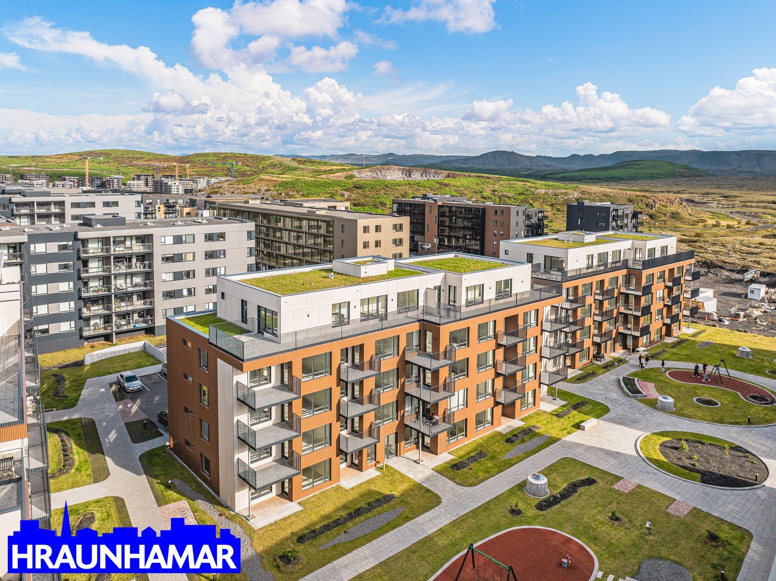 BÓKIÐ SKOÐUN - Einar s. 888-7979 Helgi s. 893-2233 Glódís s. 659-0510, Hlynur s. 698-2603 Hraunhamar kynnir: Glæsilega fjögurra herbergja endaíbúð á 2. hæð með svölum í nýju vönduðu lyftuhúsi á frábærum stað í Hamraneshverfinu í Hafnarfirði, þar sem stutt er í alla helstu þjónustu. Íbúðirnar afhendast fullbúnar með gólfefnum, innbyggðum ísskáp og uppþvottavél. Afhending við kaupsamning.Íbúð 205 er fjögurra herbergja, skráð 109 fermetrar með geymslu. Auk þess fylgir stæði með í lokaðri bílageymslu. Sjá nánar um íbúðina hér. Sjá söluvef hér.