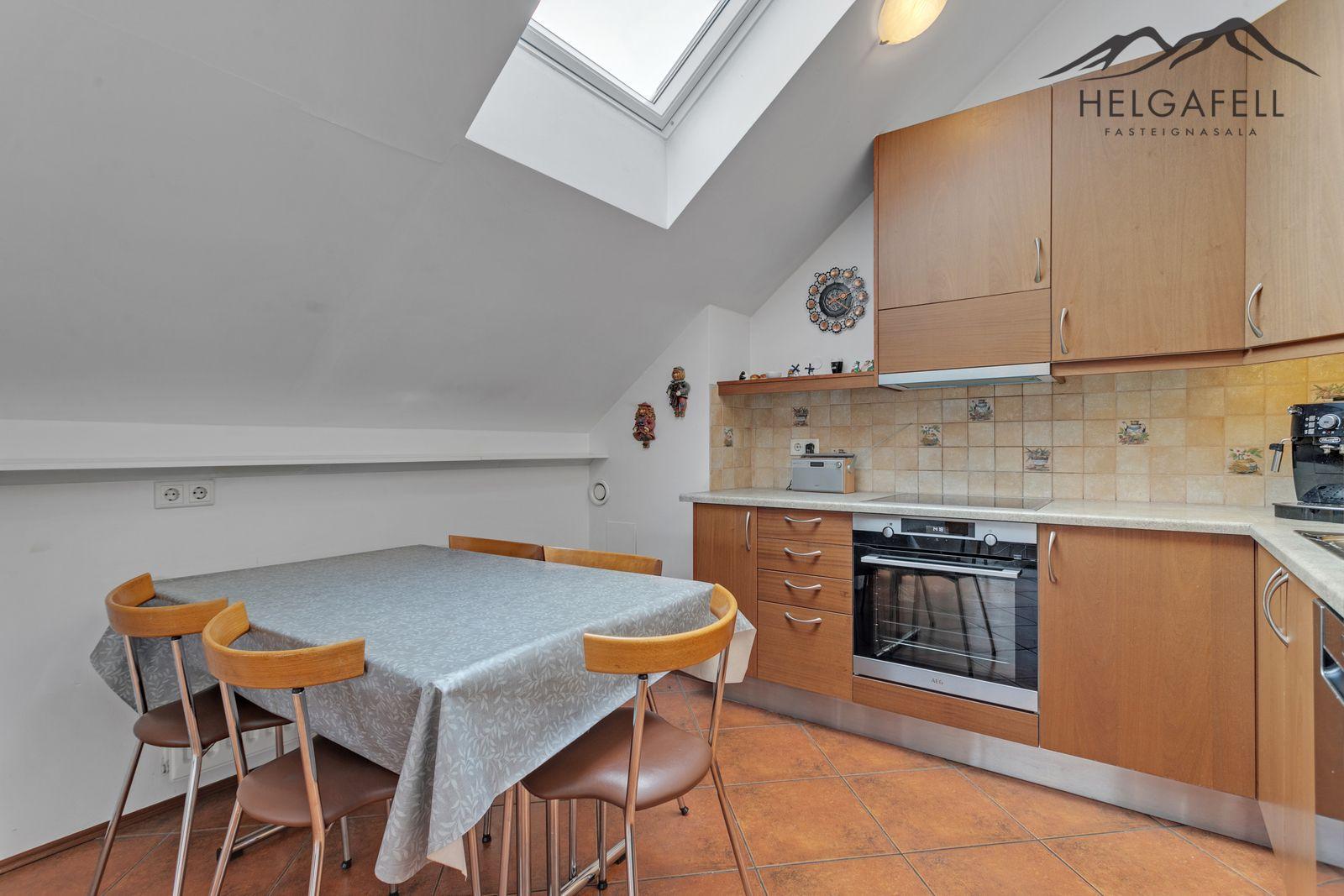 Eldhús: Í alrými á efri hæð, mikil lofthæð, borðkrókur, góð innrétting, bakaraofn, helluborð, flísar milli skápa, flísar á gólfi.