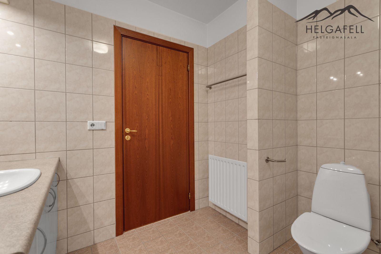 Þvottahús: Inn af forstofu, flísar á gólfi.