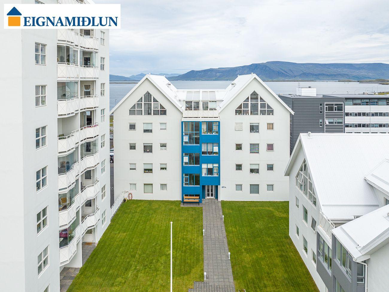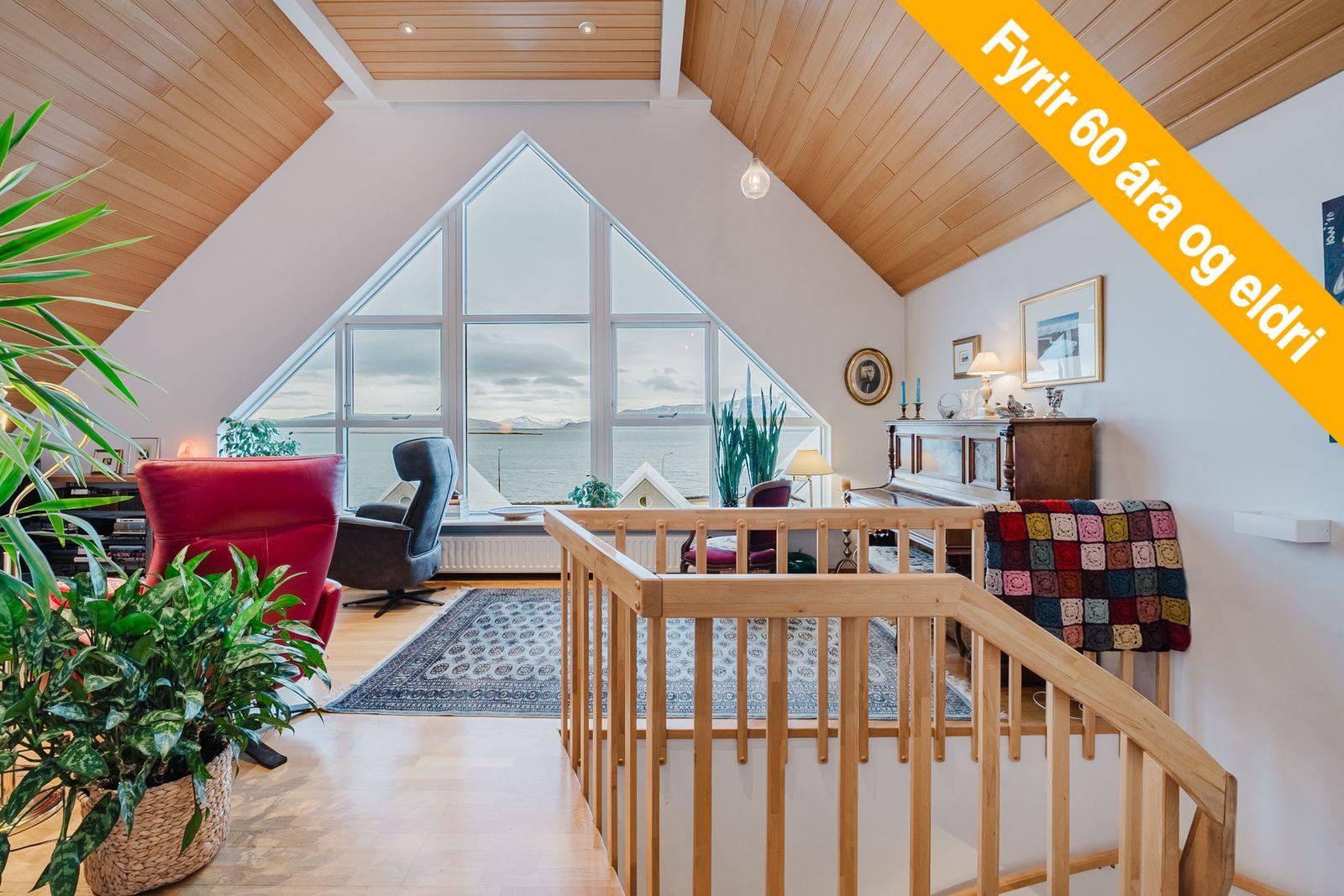 2 hæð: Gengið er upp teppalagðar tröppur úr holi. Komið er upp í stóra, opna og bjarta stofu með einstöku útsýni yfir faxaflóann. Úr stofunni er gengið inn í rúmgott svefnherbergi með góðum skápum og sérbaðherbergi með baðkari, nýjar flísar á gólfi og ljósar flísar á veggjum. Við hinn enda stofunar er yfirbyggður, flísalagður sólskáli, úr honum er gengið út á svalir sem snúa til norðurs og eru með glæsilegt útsýni yfir Faxaflóann. Parket er á gólfum að undanskyldu baðherbergi og sólstofu.