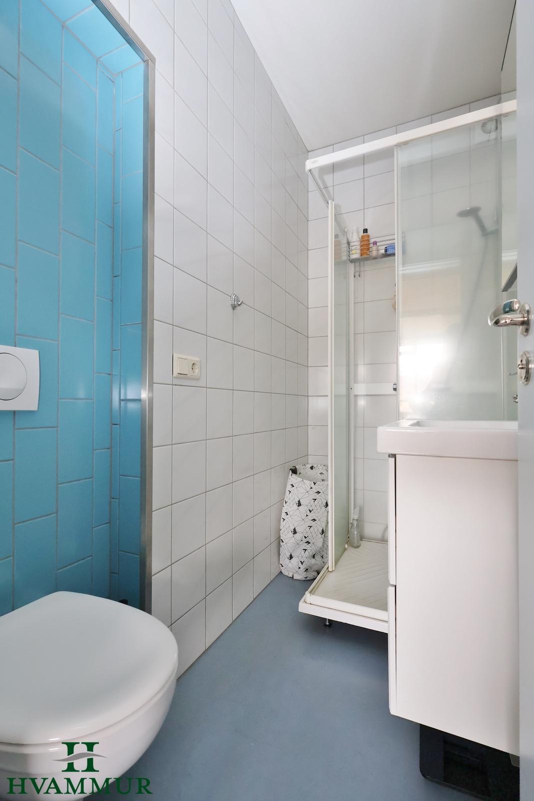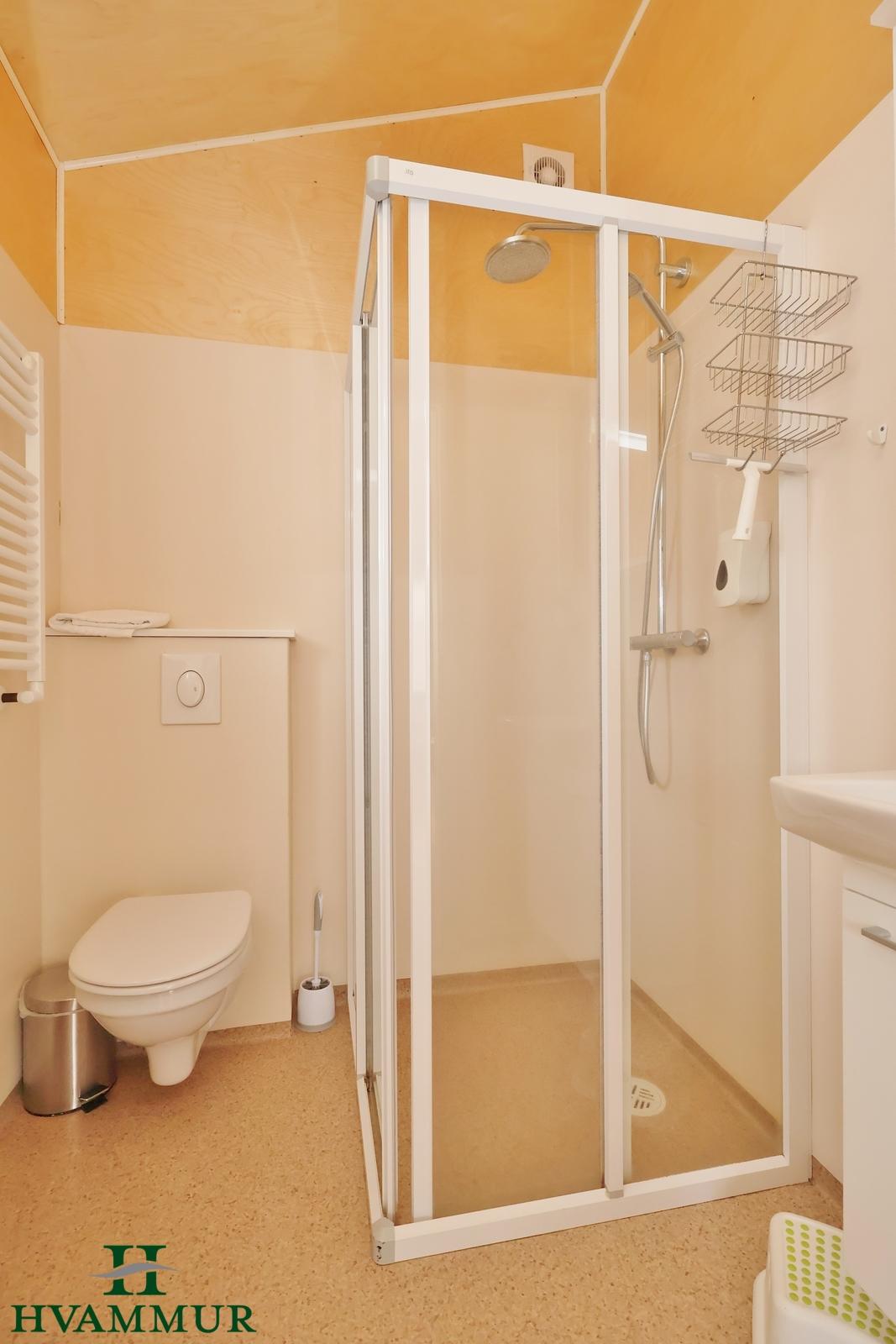 Baðherbergi er með sturtuklefa, dúk á gólfi og flísum á veggjum, en einnig er salerni á hæðinni og hvar hægt væri að koma fyrir sturtu. Þar er dúkur á gólfi og flísar á veggjum.