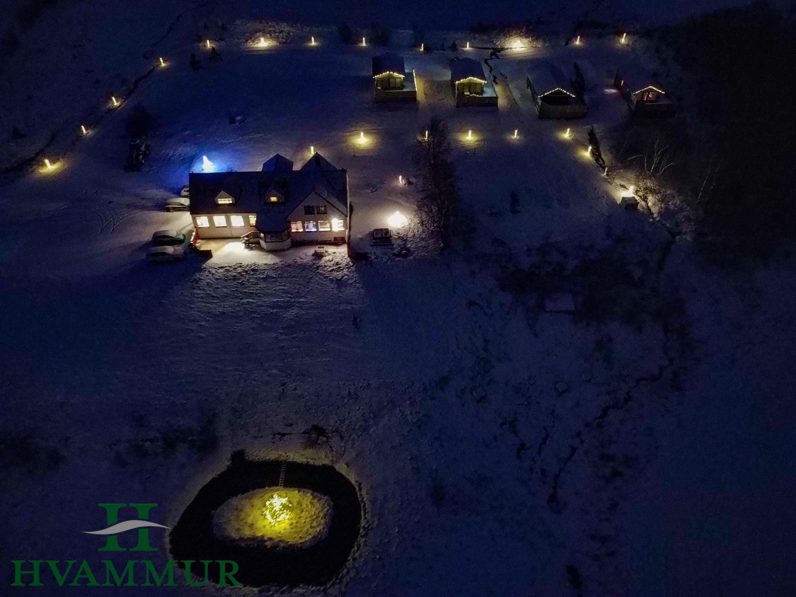 Hellulögð verönd er sunnan við húsið og með vesturhlið auk þess hellulögð stétt með með austurhlið hússins. Heitur pottur er sunnan við húsið (bilaður sem stendur). Stór bílaplan er norðan við húsið og heimreið að frístundahúsunum. Sér bílastæði er við hvert hús.