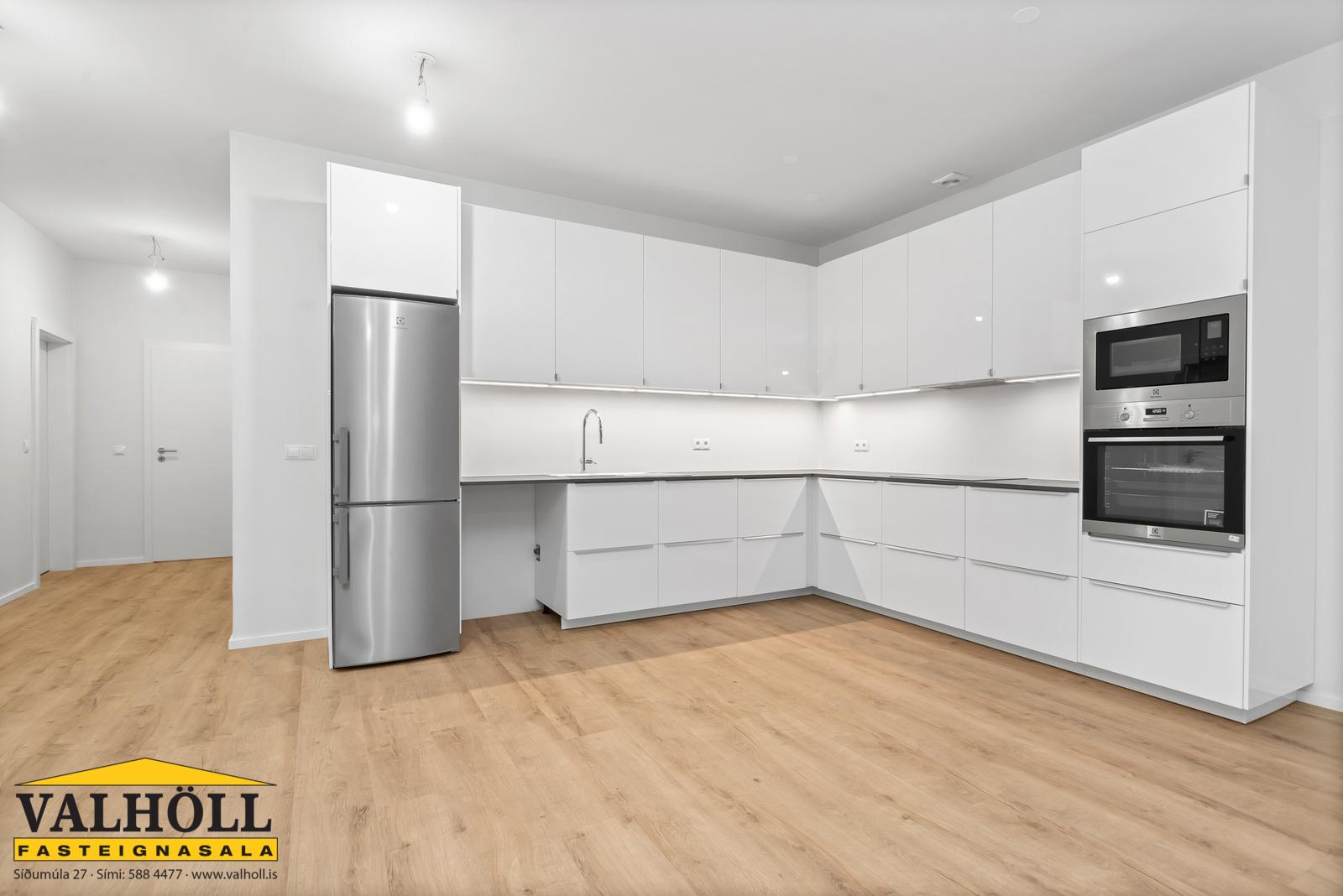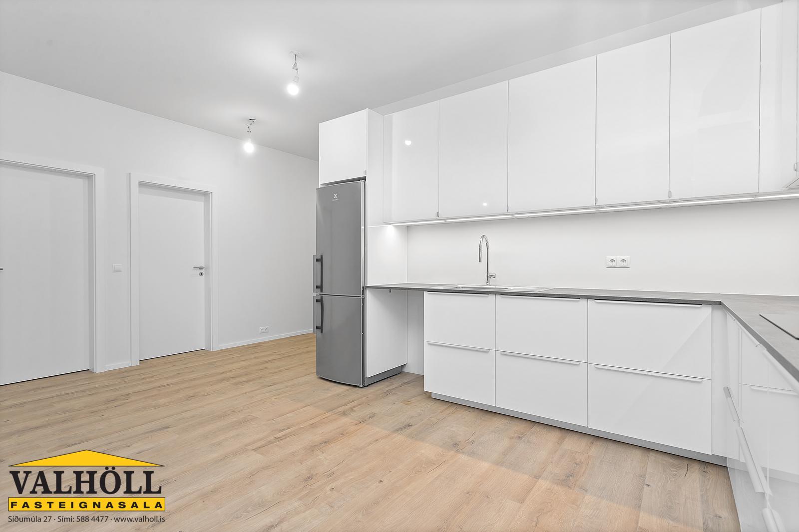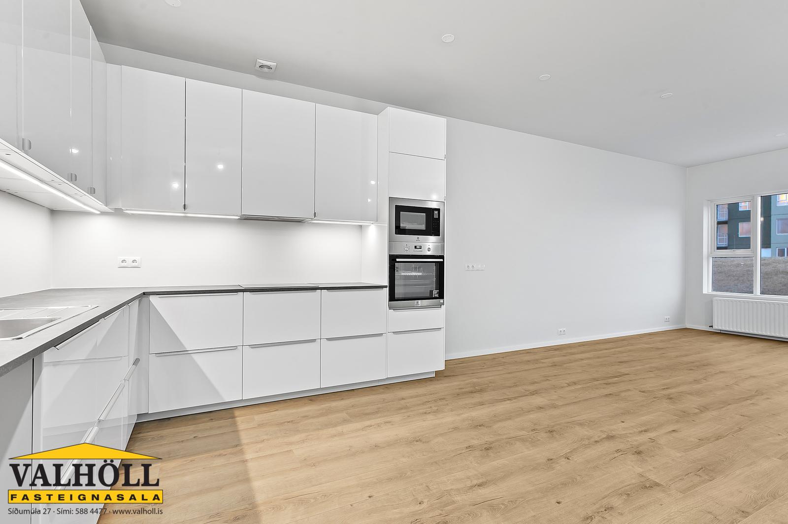 Eldhús: með hvítri innréttingu með miklu skápaplássi, span helluborði, bakaraofn í vinnuhæð, ísskáp og örbylgjuofn.