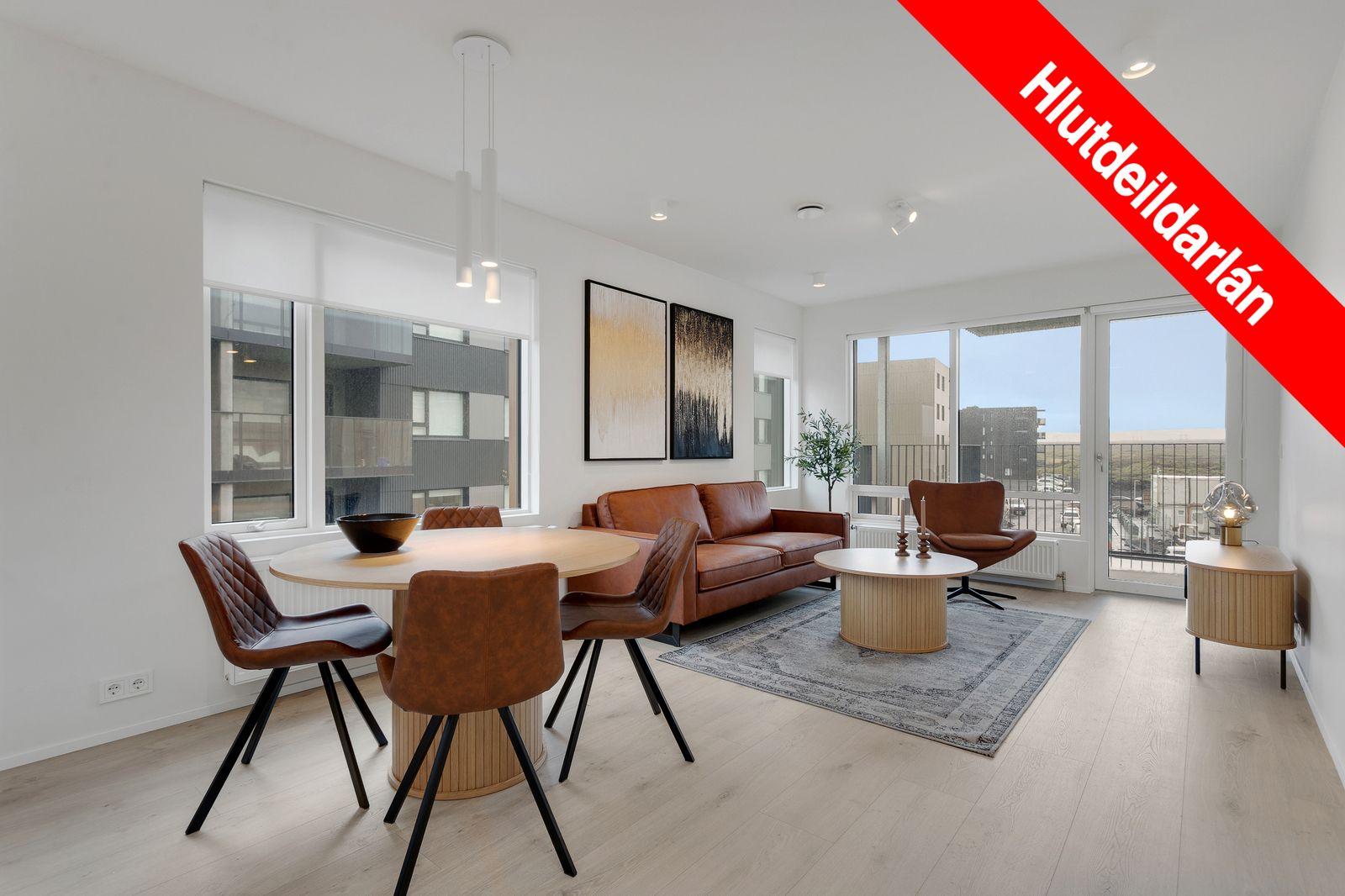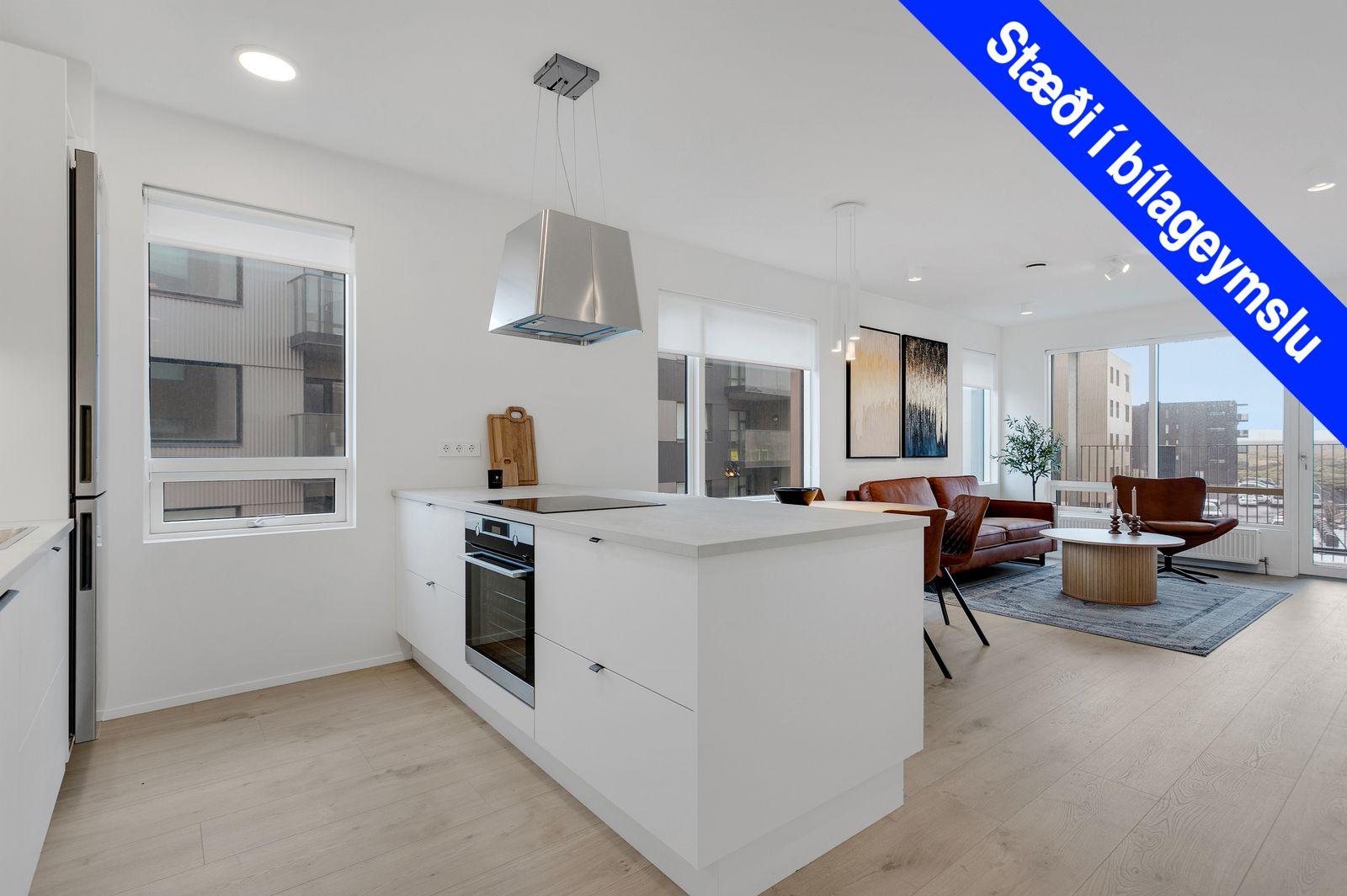 Íbúð 503 er þriggja herbergja íbúð á efstu hæð, skráð 80,3 fermetrar með geymslu. Auk þess fylgir stæði með í lokaðri bílageymslu. Afhending við kaupsamning. Sjá nánar um íbúðina hér. Íbúðirnar afhendast fullbúnar án gólfefna en votrými verða flísalögð.