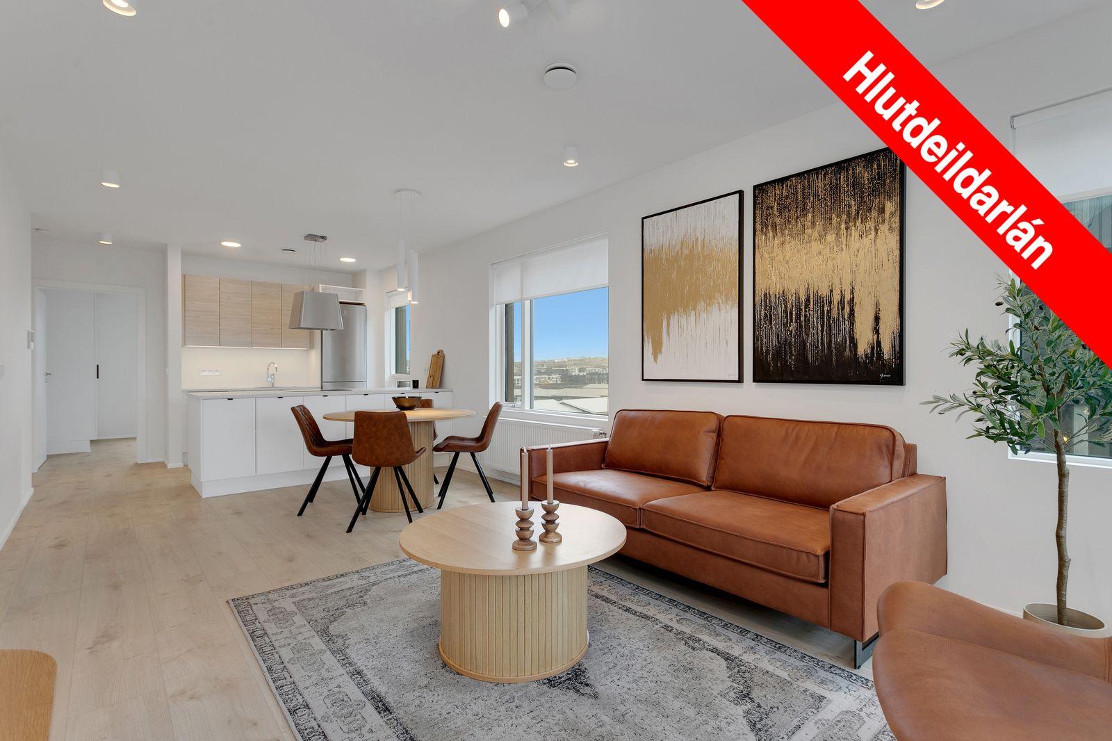 Íbúð 208 er þriggja herbergja íbúð, skráð 82,2 fermetrar með geymslu. Auk þess fylgir stæði með í lokaðri bílageymslu.