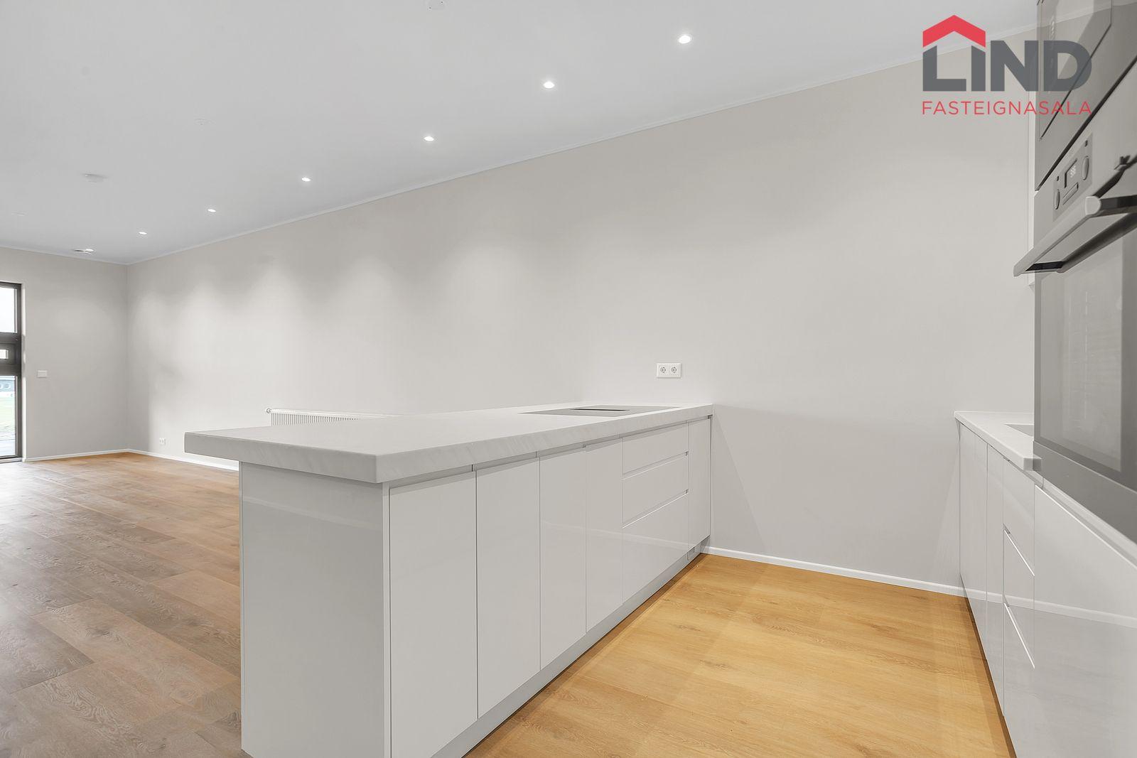 Eldhús - Eldhúsinnréttingar eru hvítar og eru sérsmíðaðar með glans áferð. - Höldur eru ekki sýnilegar - U laga eldhús með eldhúshellu þar sem hægt er að hafa 2-3 stóla við. - Borðplata er úr Corian & er eldhusvaskur hannaður ofan í plötuna í sama efni. Liturinn er dökkur marmaraáferð.