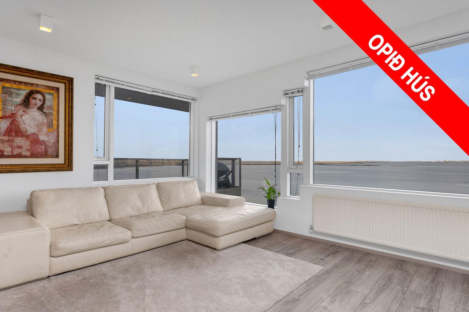 Stofa/borðstofa: Er opin og björt með stórum gluggum og glæsilegu sjávarútsýni. Frá stofu er gengið út á rúmgóðar vestursvalir.