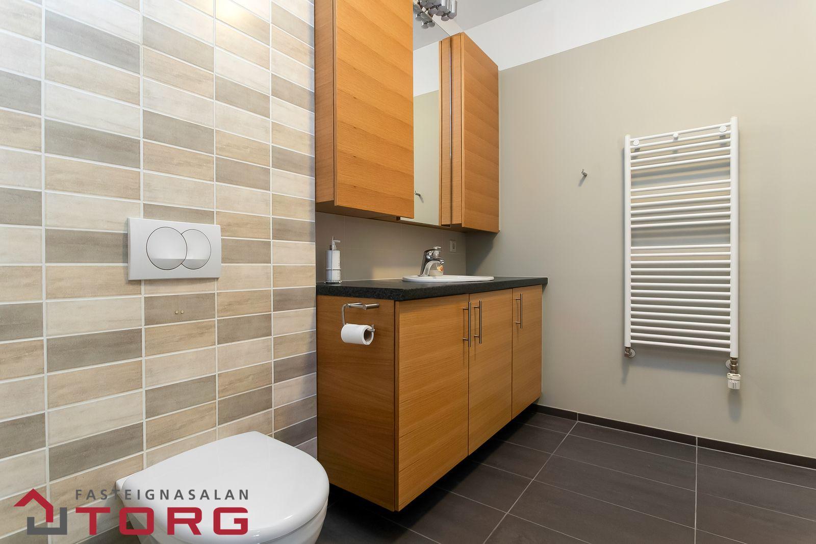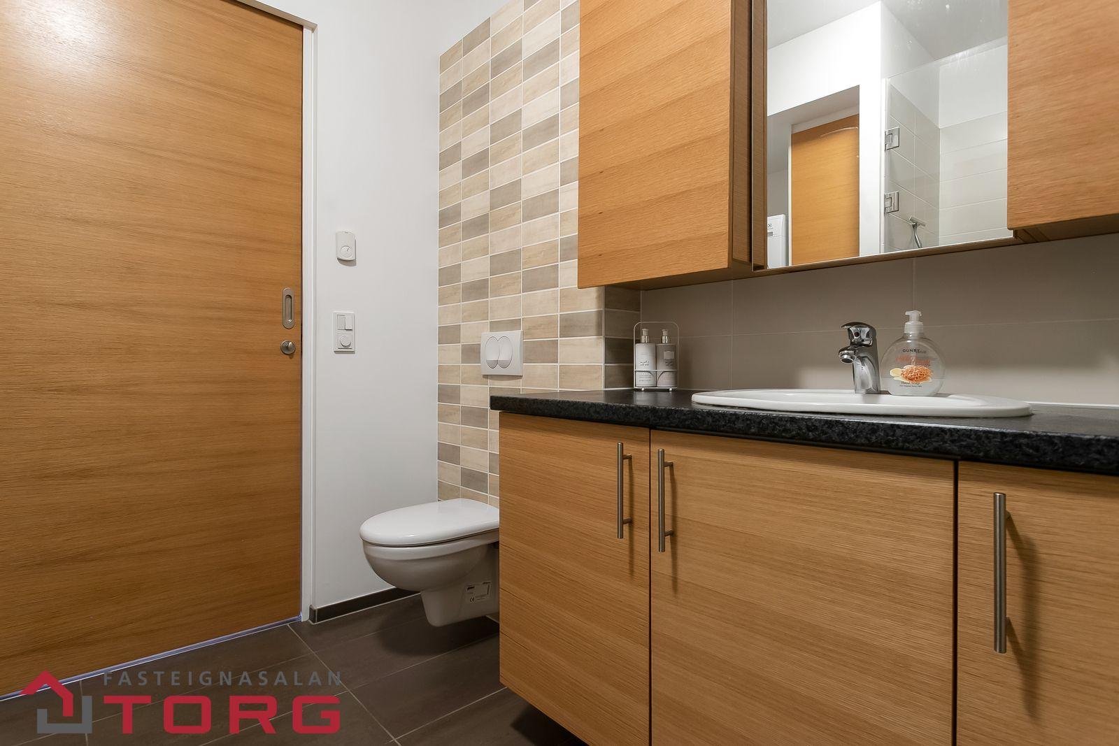 Rúmgott alrými sem skiptist í eldhús, stofu og borðstofu. Mikil lofthæð. Gólfsíðir gluggar með sólarfilmu og felligardínum. Útgengt út á stóra afgirta timburverönd sem snýr til suðurs og vesturs. Eldhúsið með eyju með vaski, falleg viðarinnrétting, tengi fyrir uppþvottavél, ísskápur fylgir með í kaupunum. Hjónaherbergi með innbyggðum skápum á heilum vegg, parket gólfi. Mjög stór gluggi er í herbergi. Tvö önnur rúmgóð herbergi með skápum, parket á gólfi. Baðherbergi með "walk in" sturtu, góð innrétting við vask, tengi fyrir þvottavél og þurrkara, flísar á gólfi og veggjum að hluta. Geymsla með innréttingum, flísar á gólfi. Í bílakjallara er sér geymsla innaf bílastæði. Þvottaplan er í bílageymslu. Samningur við ON um leigu á hleðslustöðvum og þjónustu á rafhleðslukerfi.