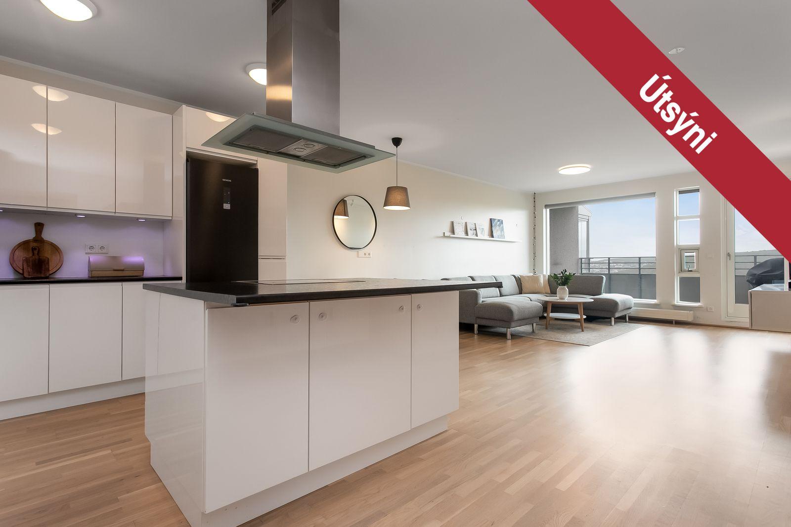 Stofa/borðstofa er samliggjandi í björtu og opnu rými opið við eldhús og með parket á gólfi. Úr stofu er gengið út á svalir með glæsilegu útsýni.