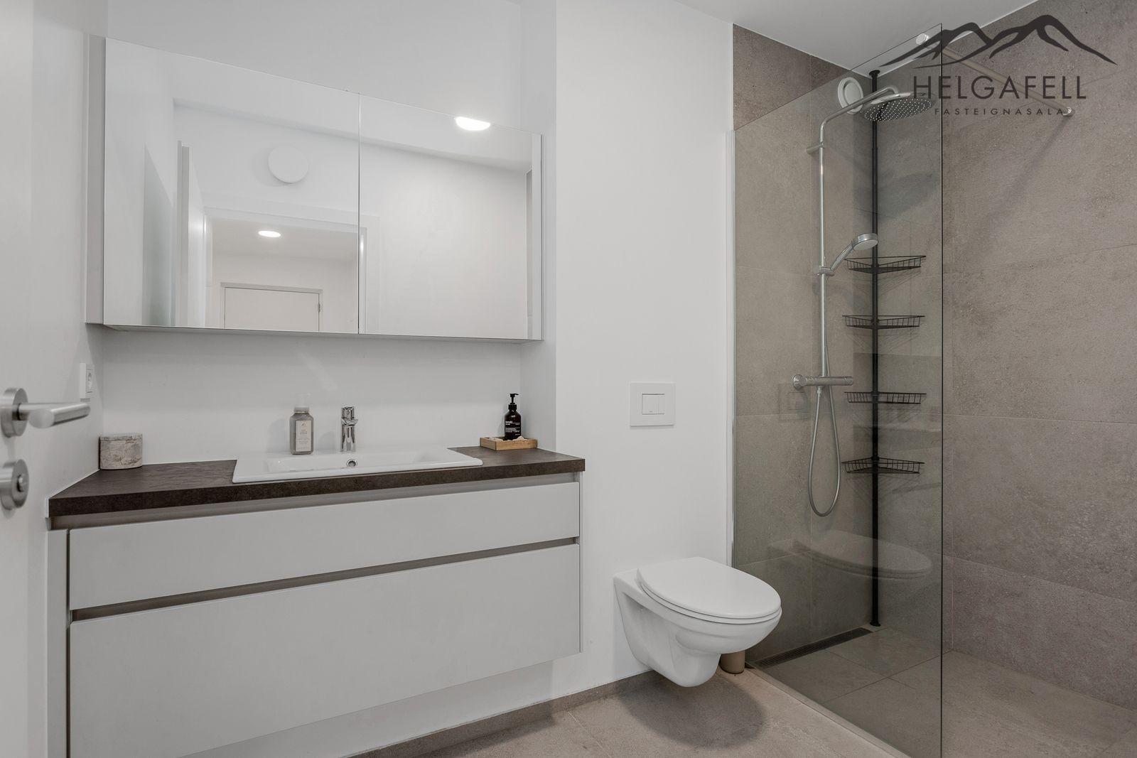 Baðherbergi með góðu skápaplássi, walk in sturtu, upphengt salerni.