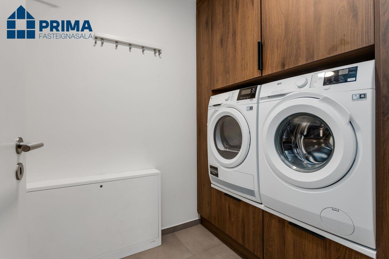 Þvottahús innan íbúðar með flísum á gólfi, vönduð innrétting fyrir þvottavél og þurkara.
