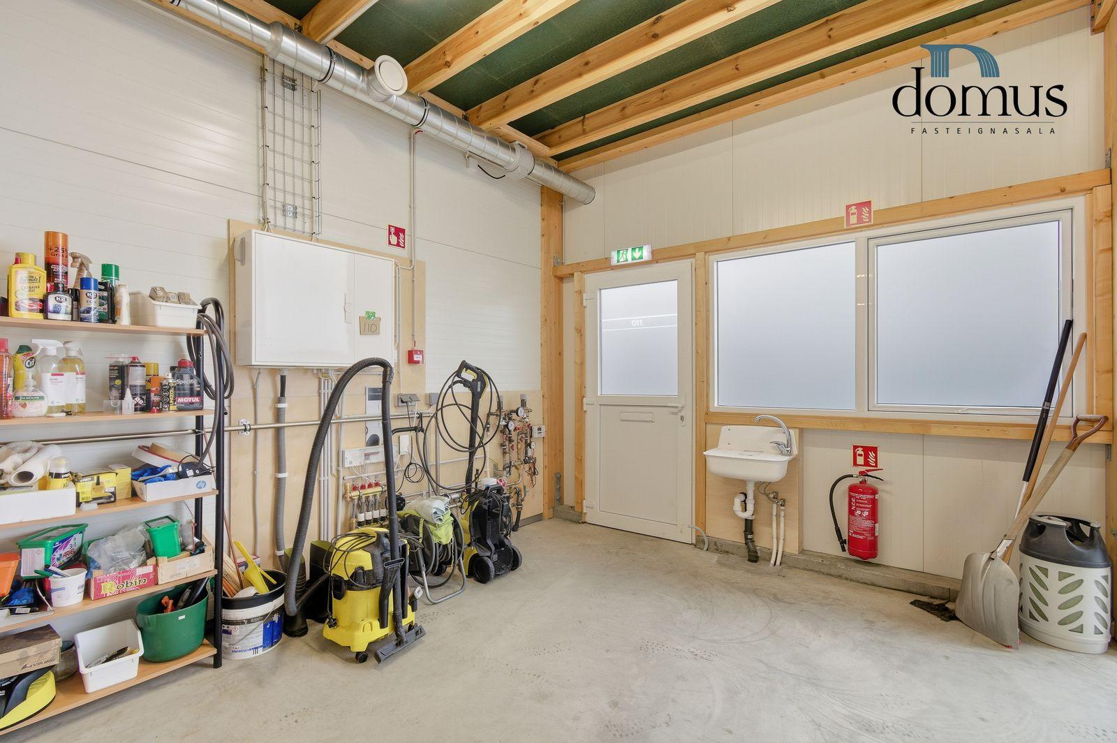 Stórar innkeyrsludyr eru á húsnæðinu og því mjög hentugar fyrir stærri bíla og tæki. Húsnæðið er með rafknúinni loftræstingu, góðri salernisaðstöðu og gólfhita.