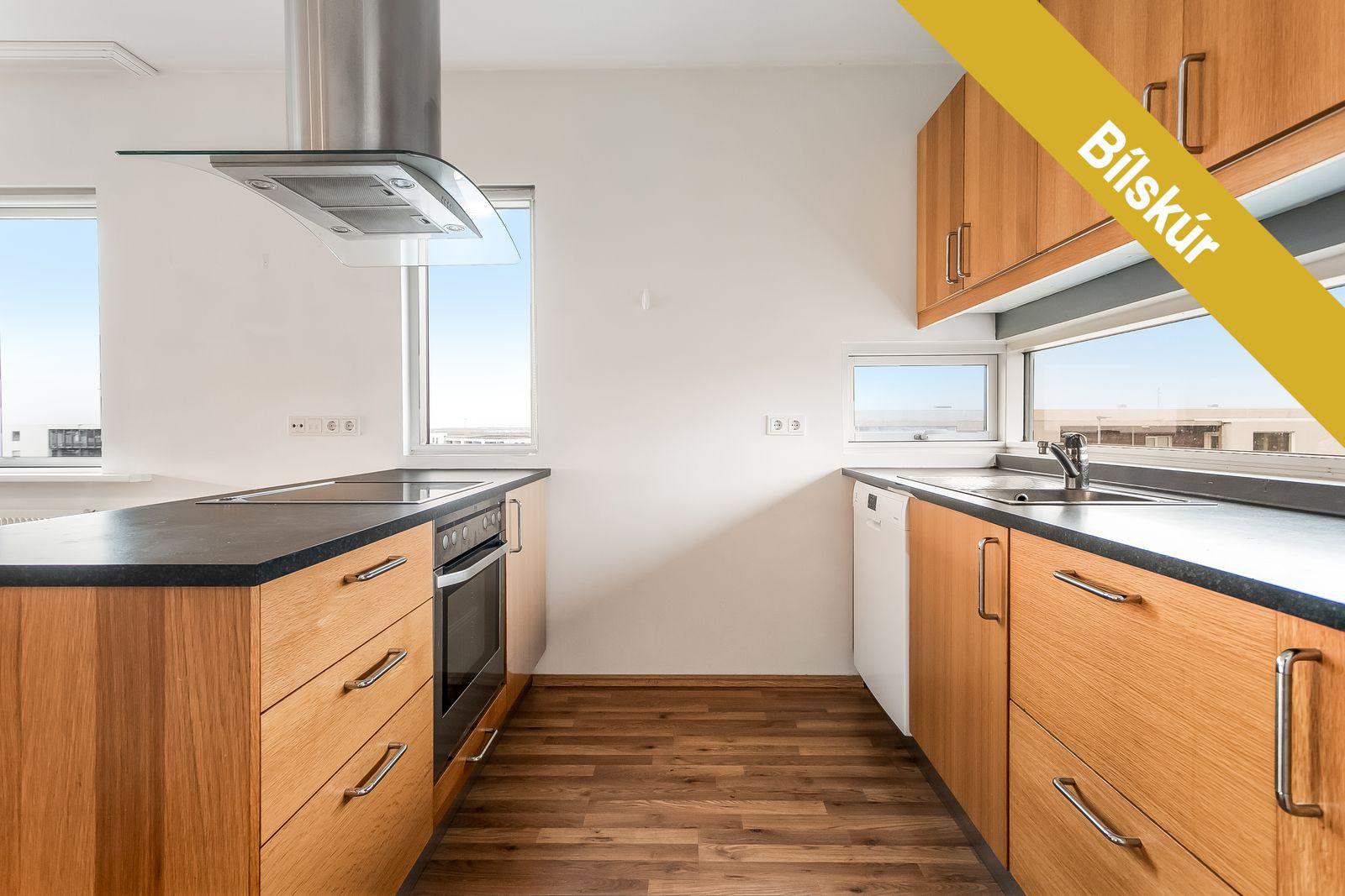 Bílskúr er með rafdrifinni hurð. Vaskur og opnanlegur gluggi.