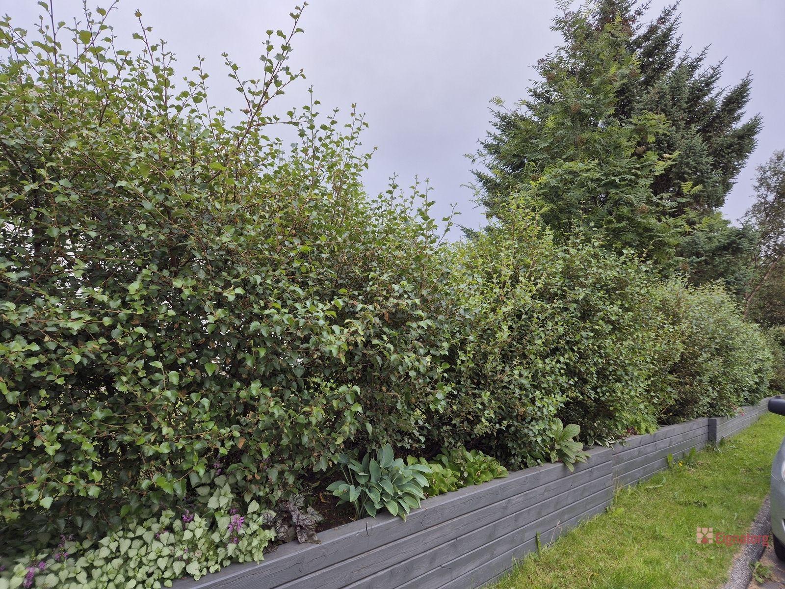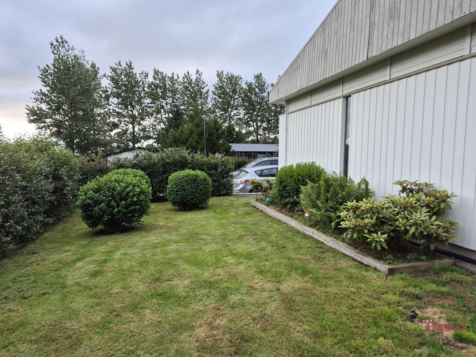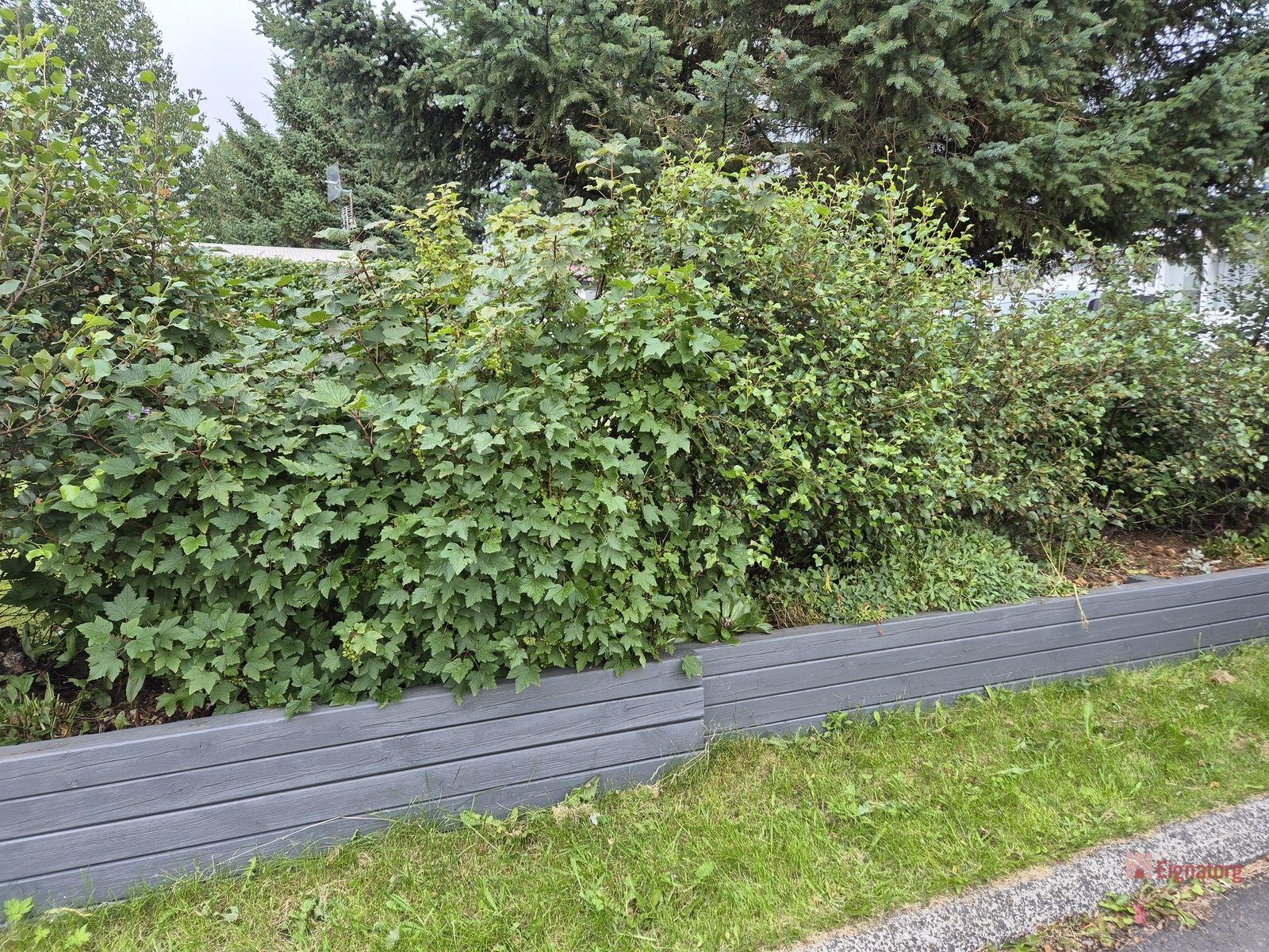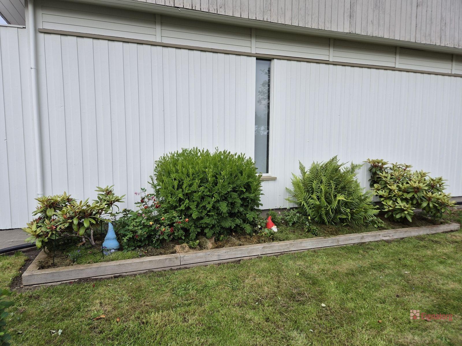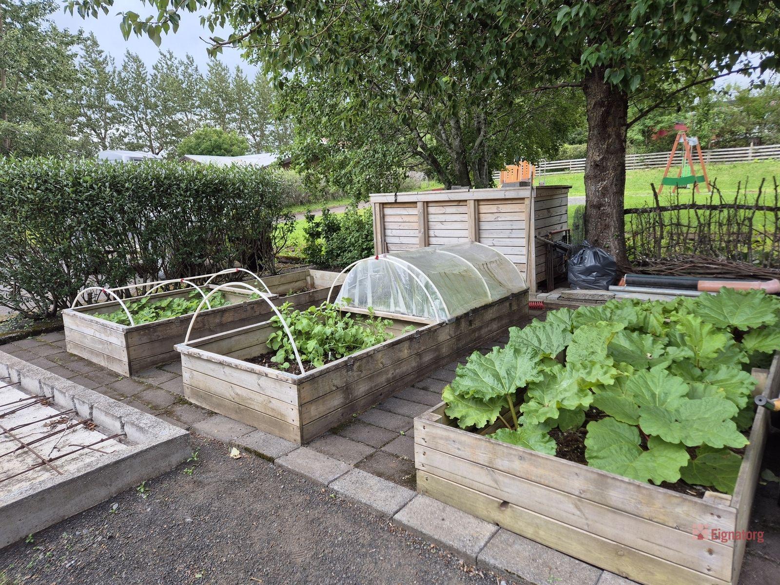 Lóðin er falleg og vel ræktuð með trjám, fjölærum blómum, matjurtagarði, moltukössum, gljámispils- og berjarunnum.